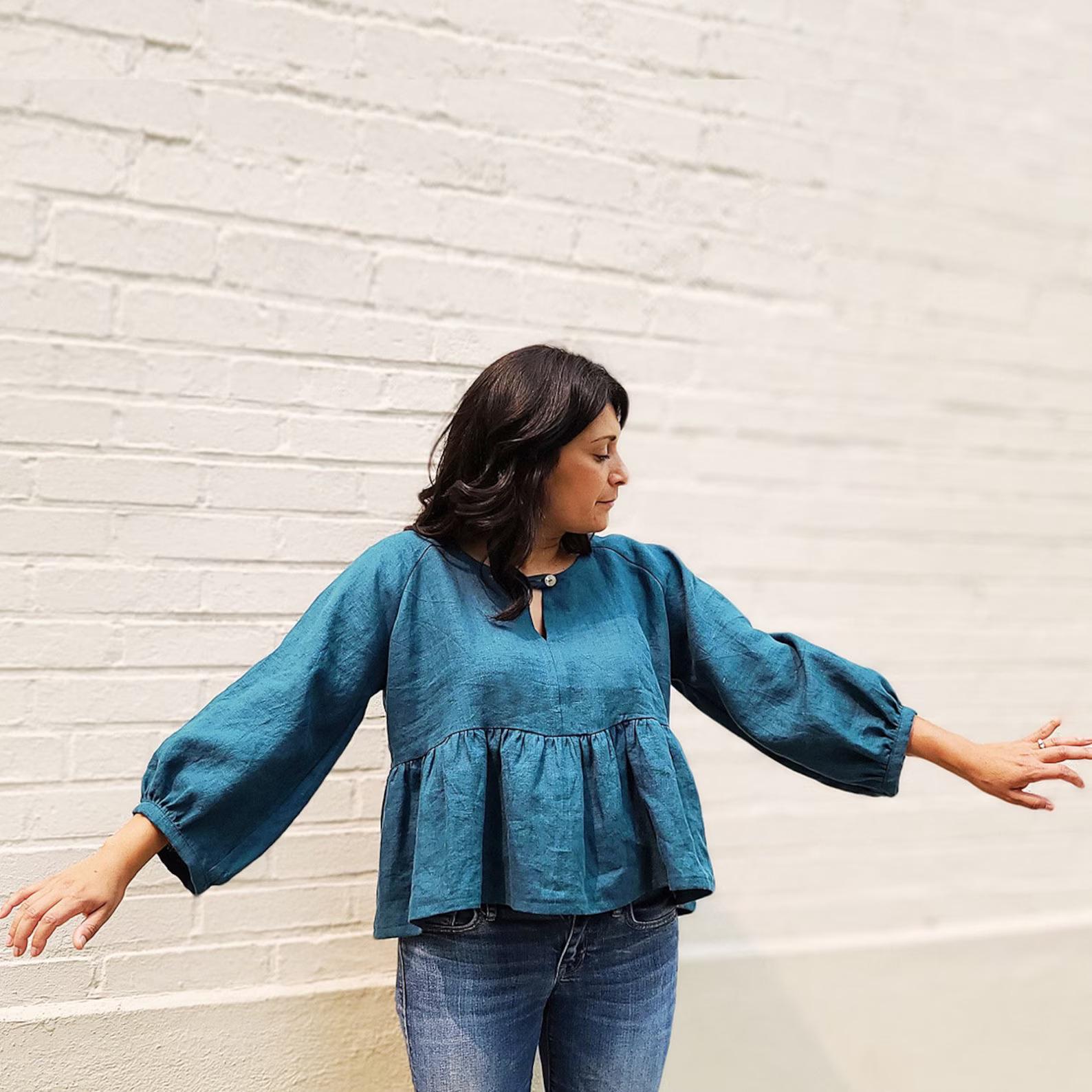 The Romey Gathered Dress & Top pattern is inspired by the beloved Remy Raglan pattern. Beginning with the signature Remy keyhole neckline and loose fit, we shortened the waistline into an elegant empire waist with a gathered skirt or peplum and billowy gathered sleeves at bracelet length. Both dress versions include patch pockets.