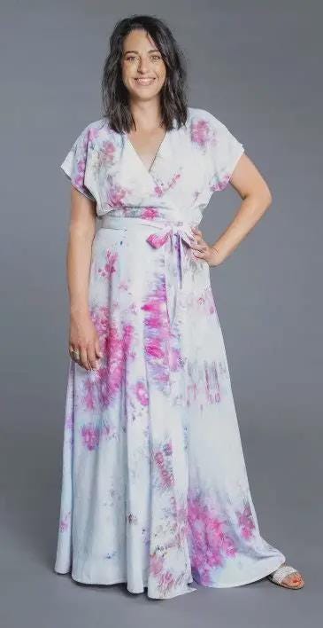 Elodie is a modern take on a classic wrap dress. Romantic and flowy with multiple skirt and sleeve options, it’s equally appropriate at a park picnic or a special wedding. Elodie features a softly flowing bodice, with release pleats under the bust and a dolman style sleeve. Choose between a short sleeve or a longer option that ends at the elbow. The skirt is swishy and voluminous and comes in three lengths (above the knee, midi or maxi), with optional patch pockets.