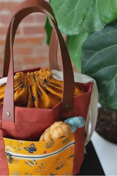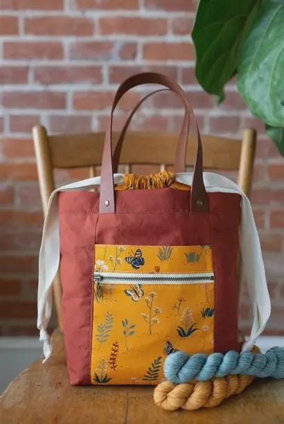 An easy to use tote and project bag! The tote size is perfect for a day trip or a work bag, and the project size is great for knitting or crochet projects, or as a lunch bag! Both sizes feature a fun drawstring closure and an interior slip pocket. A handy front pocket with an additional zippered pocket makes this tote super functional!