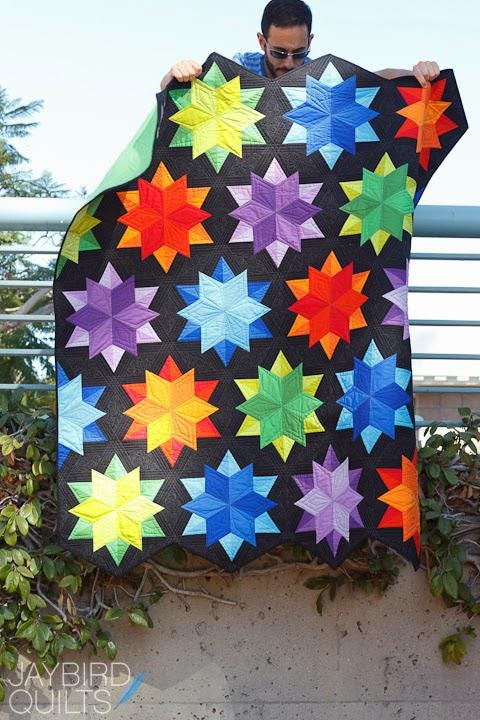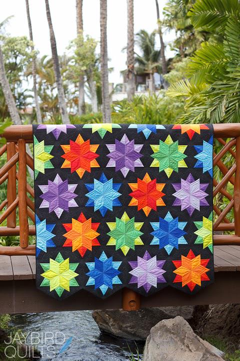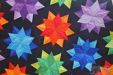Colors: Black background with red, purple, blue, yellow, and green star patterns