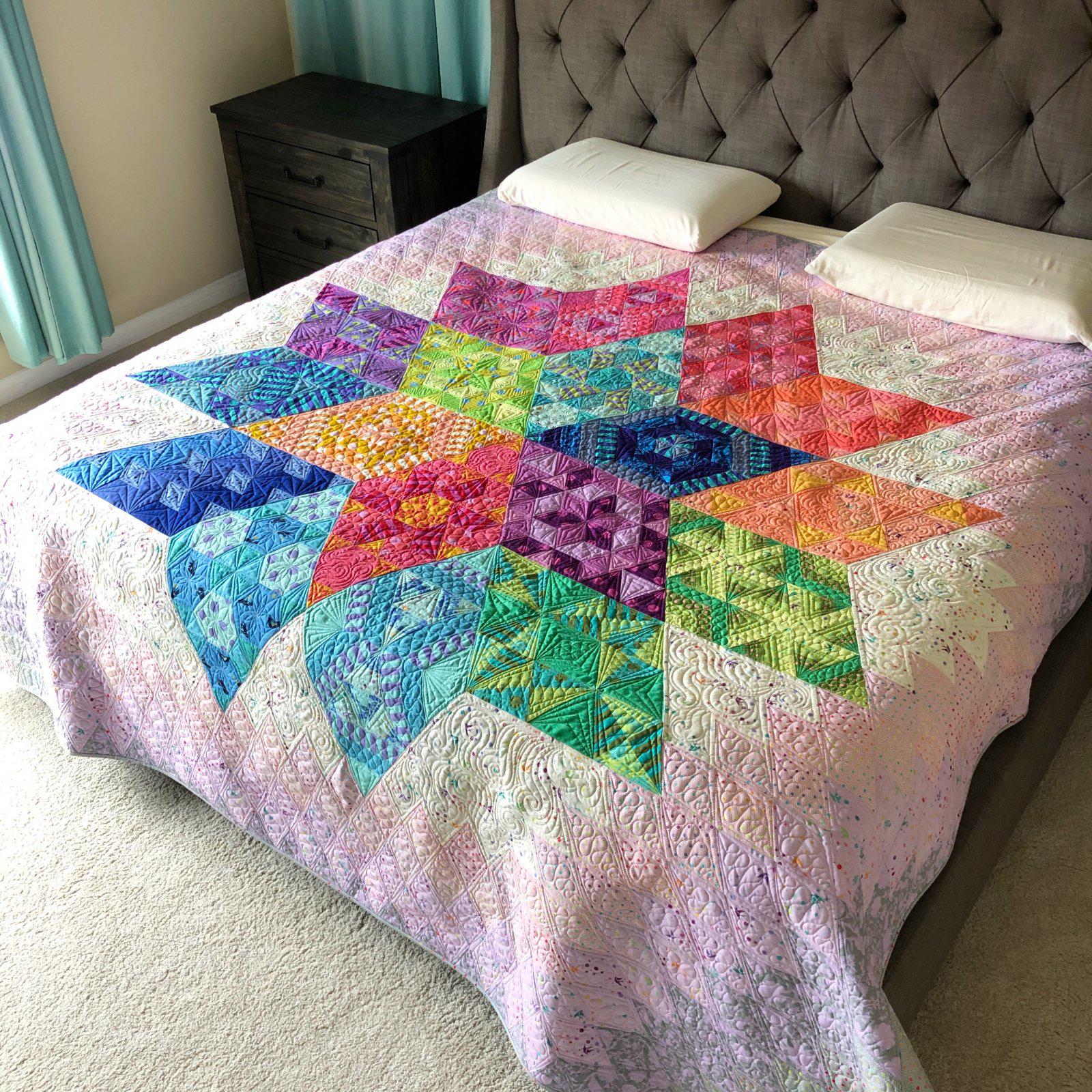 No Pesky Y Seams! Creative fabric placement will make your quilt appear to have 18 different blocks. Queen size 97in x 96in.