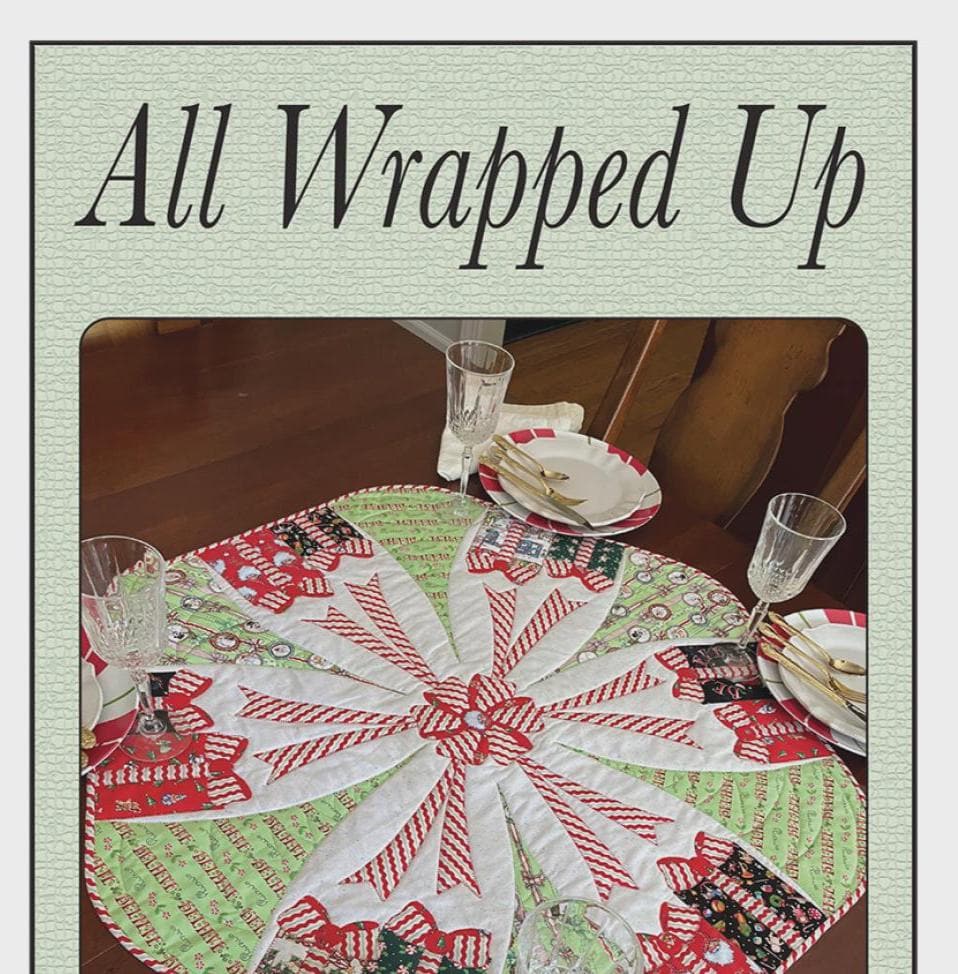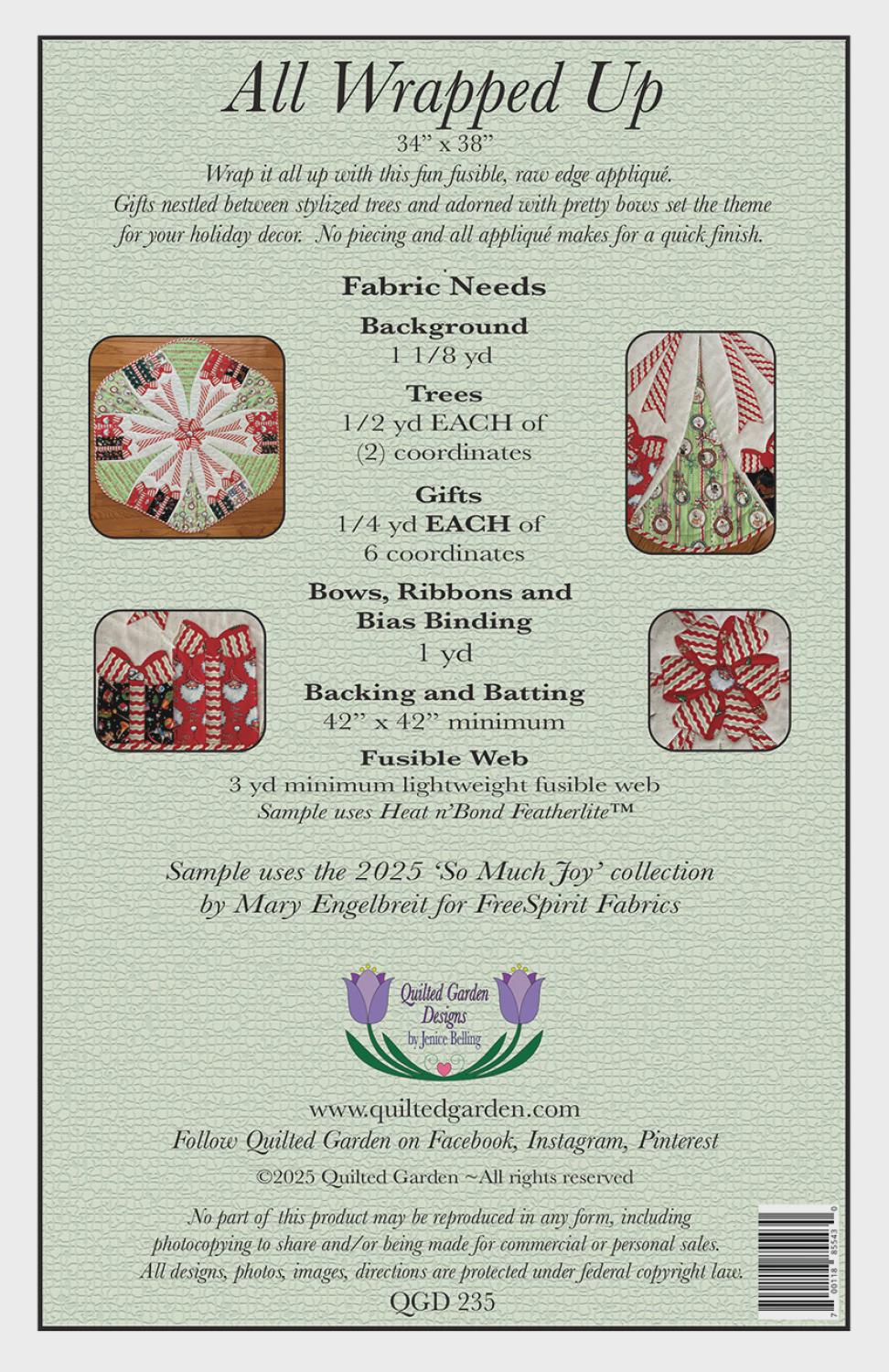 34 x 38 Wrap it all up with this fun fusible, raw edge appliqué. Gifts nestled between stylized trees and adorned with pretty bows set the theme for your holiday decor. No piecing and all appliqué makes for a quick finish.