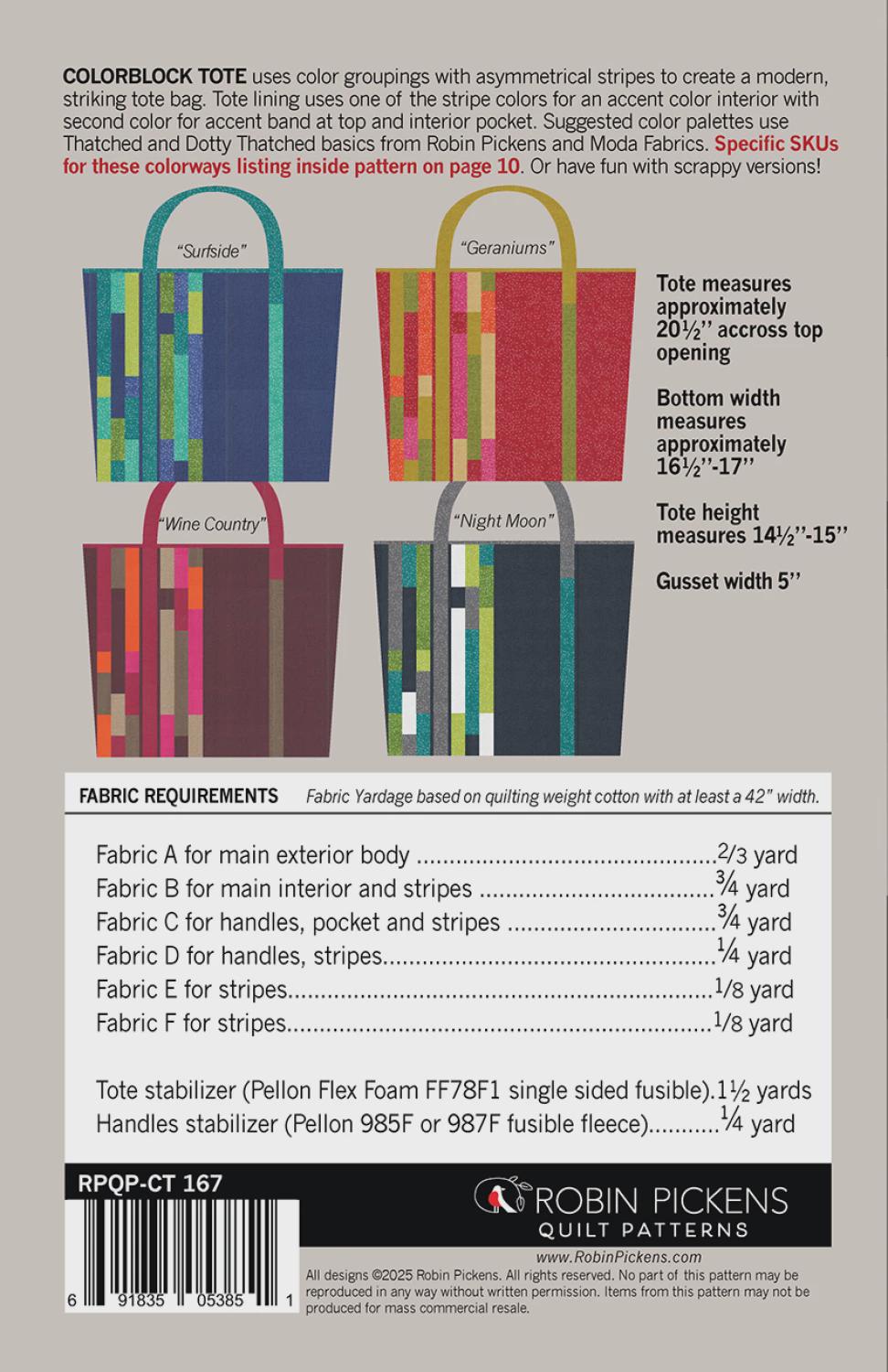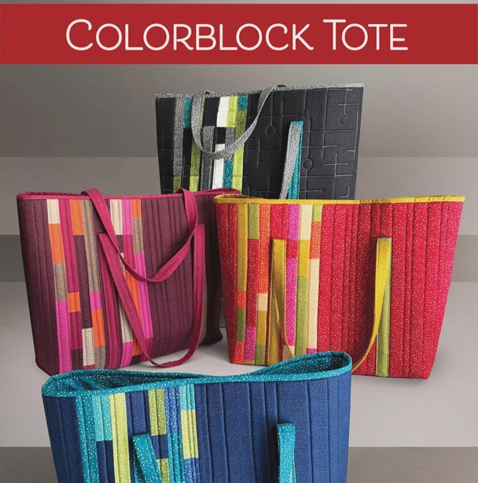 Colorblock Tote uses color groupings with asymmetrical stripes to create a modern, striking tote bag. Sample color palettes are shown including accent color for interior. Tote is sized approximately 20 1/2" across opening, bottom width is 16 1/2" -17", height 14 1/2" - 15" with side gusset of 5". Tote has interior pocket. Tote is suitable for Pellon Flex Foam or Annie's Soft and Stable or other batting/interfacing as stabilizer.