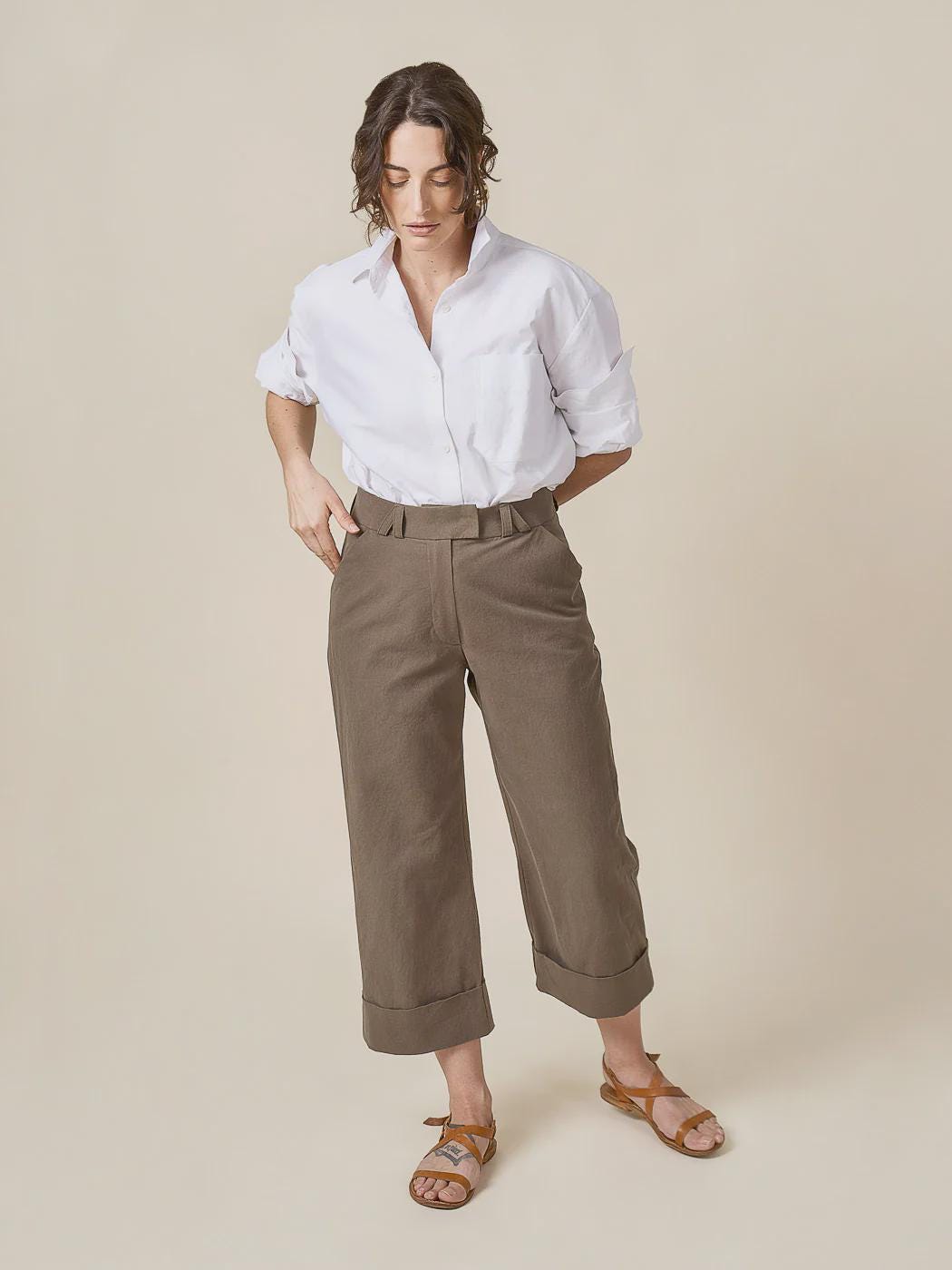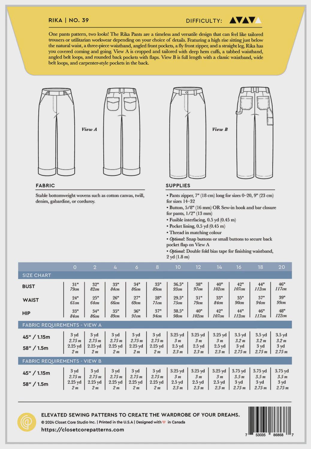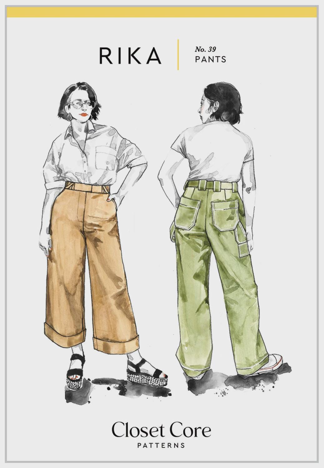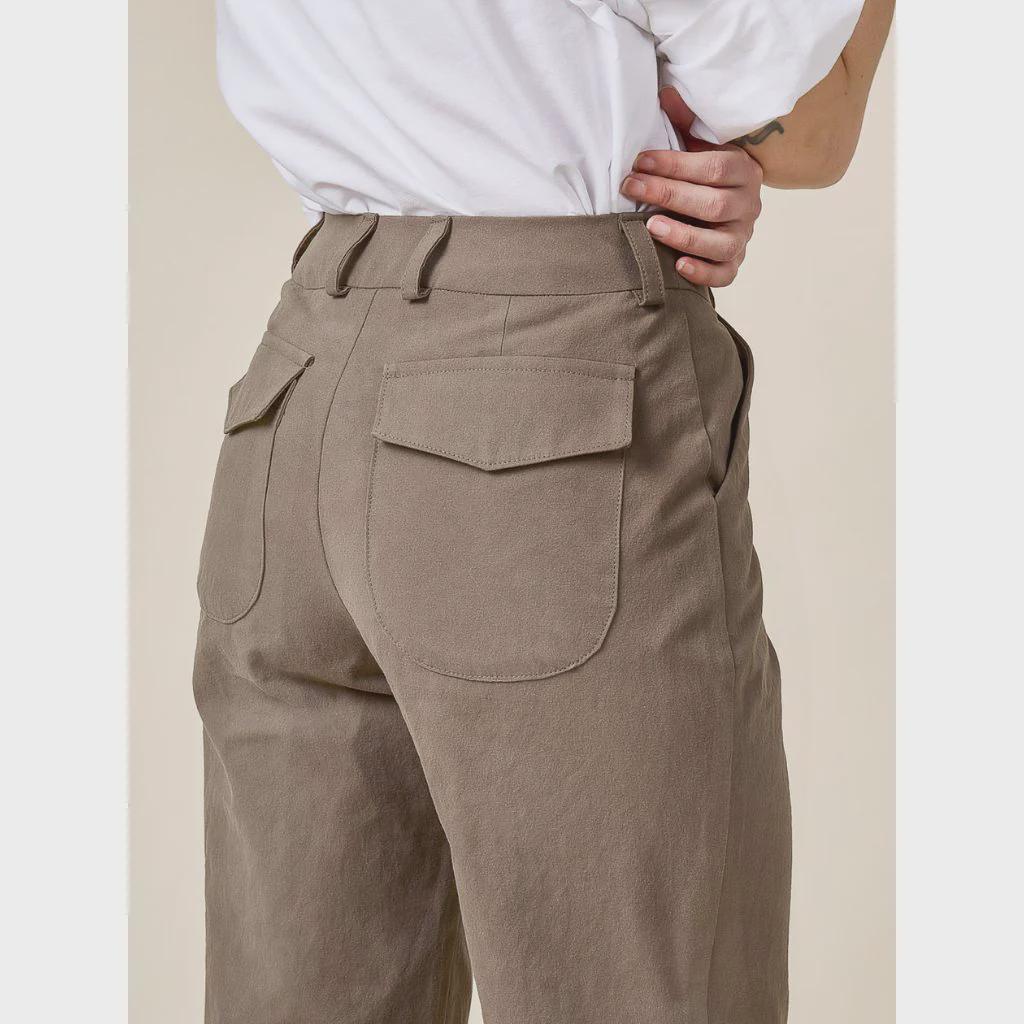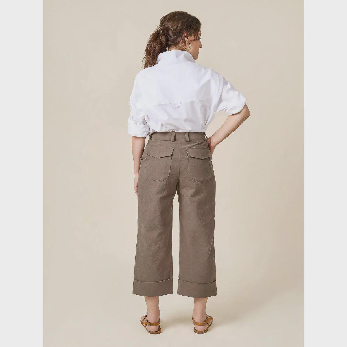 One pants pattern, two looks! The Rika Pants are a timeless and versatile design that can feel like tailored trousers or utilitarian workwear depending on your choice of details. Featuring a high rise sitting just below the natural waist, a three-piece waistband, angled front pockets, a fly front zipper, and a straight leg, Rika has you covered coming and going.