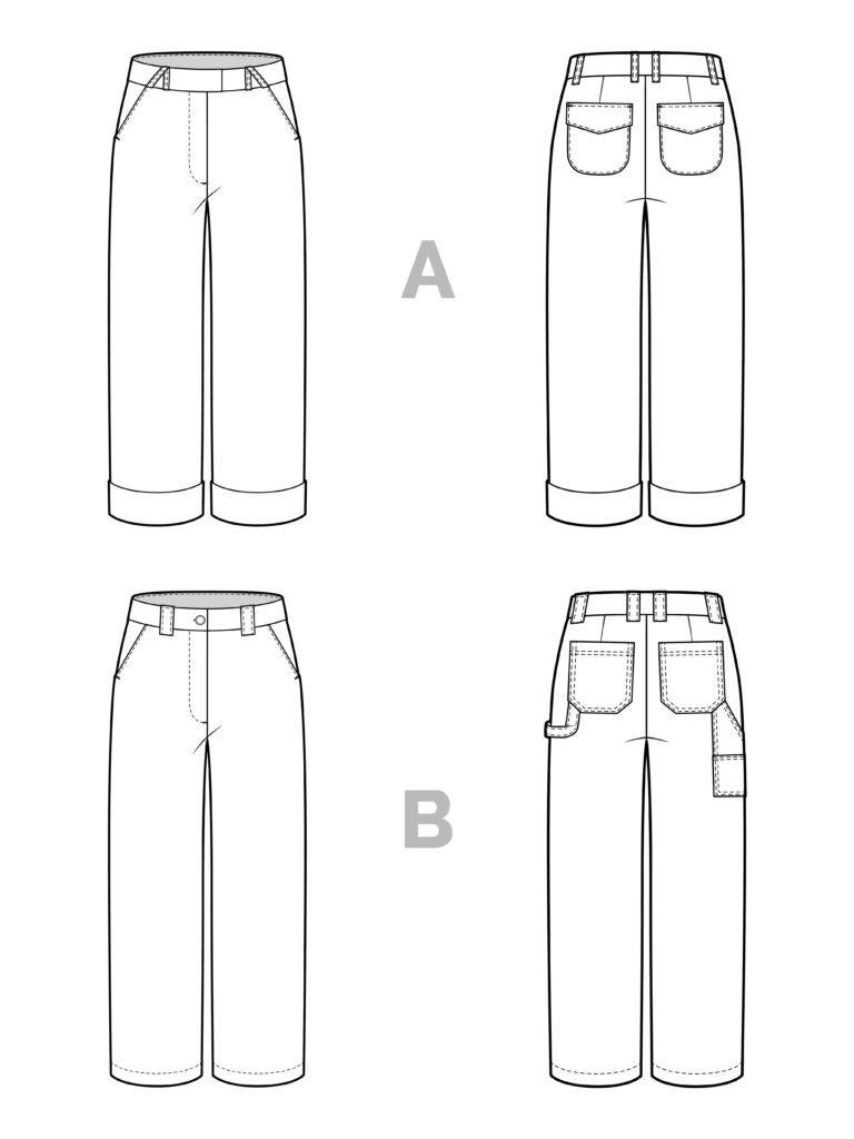 View B is full-length and utilitarian with a classic waistband, wide belt loops, and carpenter-style pockets in the back.