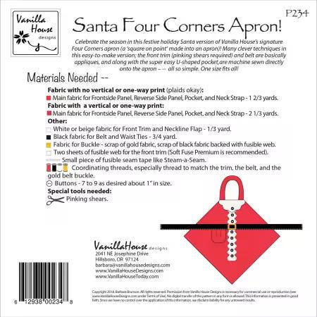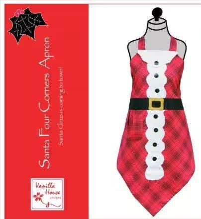 Celebrate the season in this festive holiday Santa version of Vanilla House’s signature Four Corners apron (a ‘square-on-point made into an apron)! Many clever techniques in this easy-to-make version; the front trim and belt are basically appliques, and along with the super easy U-shaped pocket, are machine sewn directly onto the apron – all so simple. One size fits all.