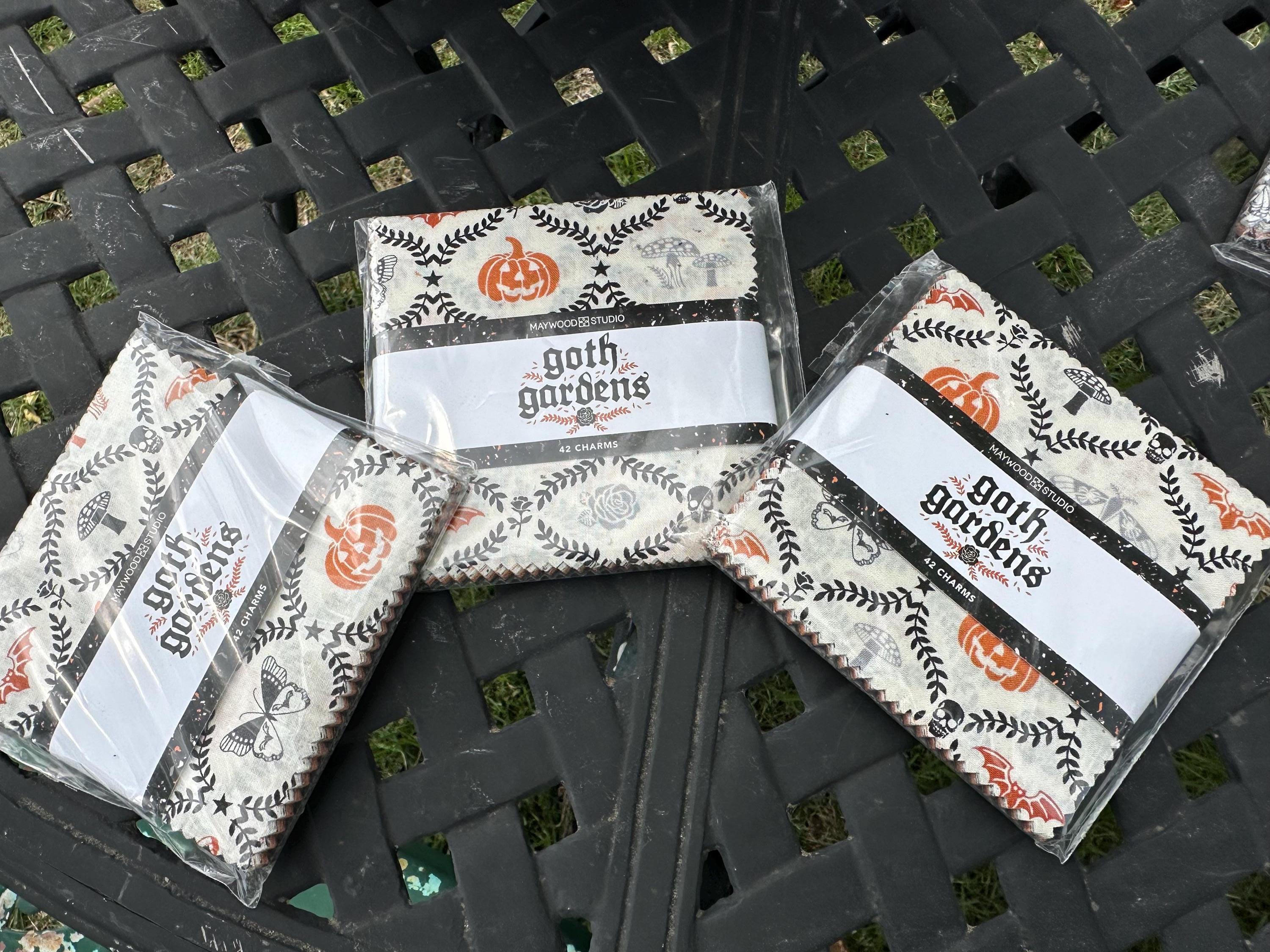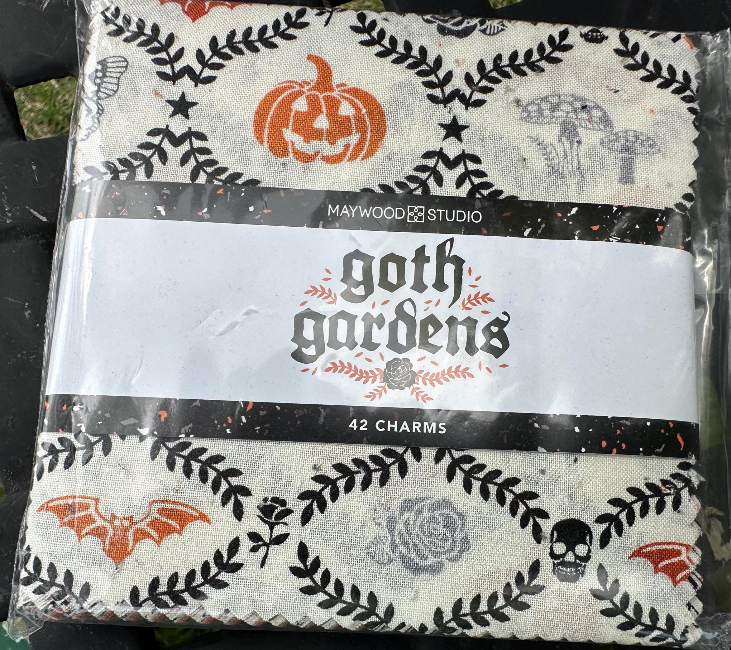 This fabric collection features a charming array of 5-inch squares, each adorned with gothic garden motifs such as pumpkins, bats, moths, and intricate vine patterns, all set against a black background with white accents. Perfect for quilters and crafters looking to add a touch of eerie elegance to their projects, this bundle offers a cohesive yet varied palette that brings a unique, thematic flair to any creation.