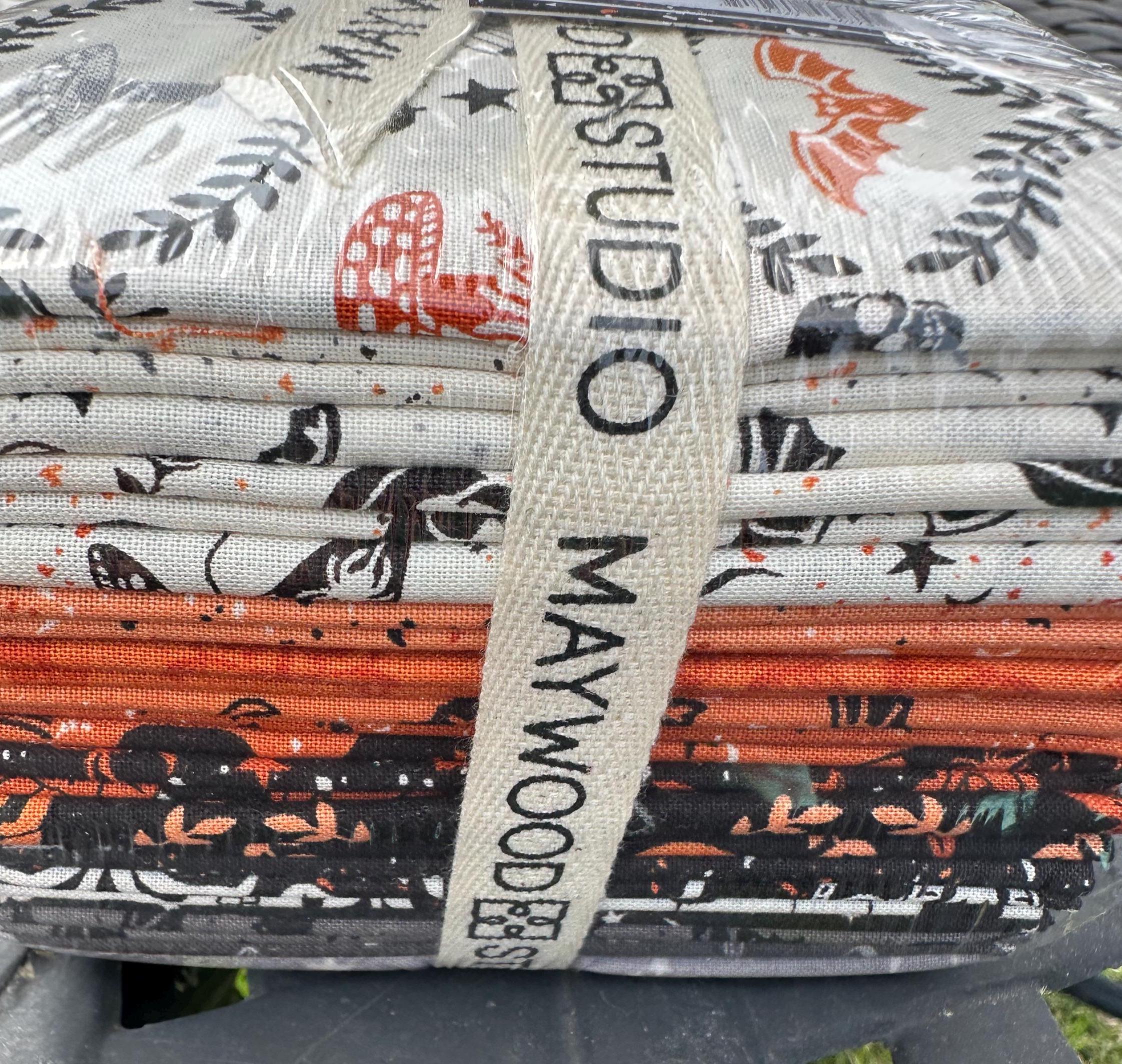 This enchanting fabric bundle features a collection of fat quarters with a gothic garden theme, perfect for crafters and quilters alike. The designs are rich with Halloween-inspired elements like bats, pumpkins, and intricate floral patterns in a palette of deep oranges, blacks, and whites. Each piece in this 20-piece bundle offers a unique pattern, ensuring versatility in projects from quilts to costumes, all while maintaining a cohesive spooky yet elegant aesthetic.