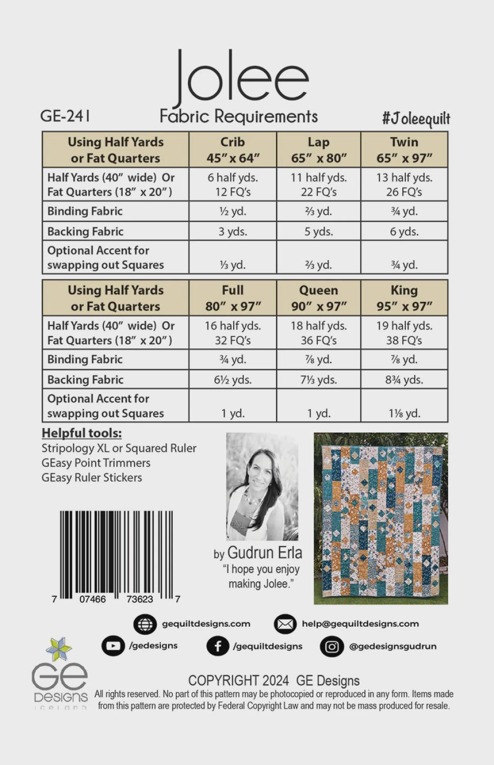 Jolee is made with Half yards or Fat Quarters. It comes in 6 sizes, Crib, Lap, Twin, Full, Queen, King. Helpful tools recommended: Stripology XL or Squared Rulers, GEasy Ruler Stickers. Instructions for regular rulers are included.