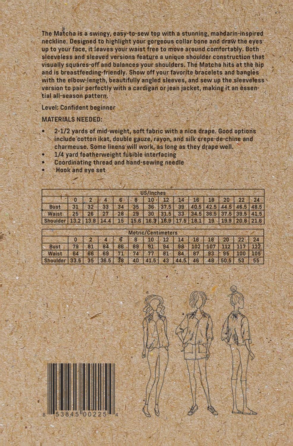The Matcha Top has both sleeveless and sleeved versions featuring a unique shoulder construction that visually squares-off and balances your shoulders. The Matcha hits at the hip and is breastfeeding-friendly. Show off your favorite bracelets and bangles with the elbow-length, beautifully angled sleeves, and sew up the sleeveless version to pair perfectly with a cardigan or jean jacket, making it an essential all-season pattern.