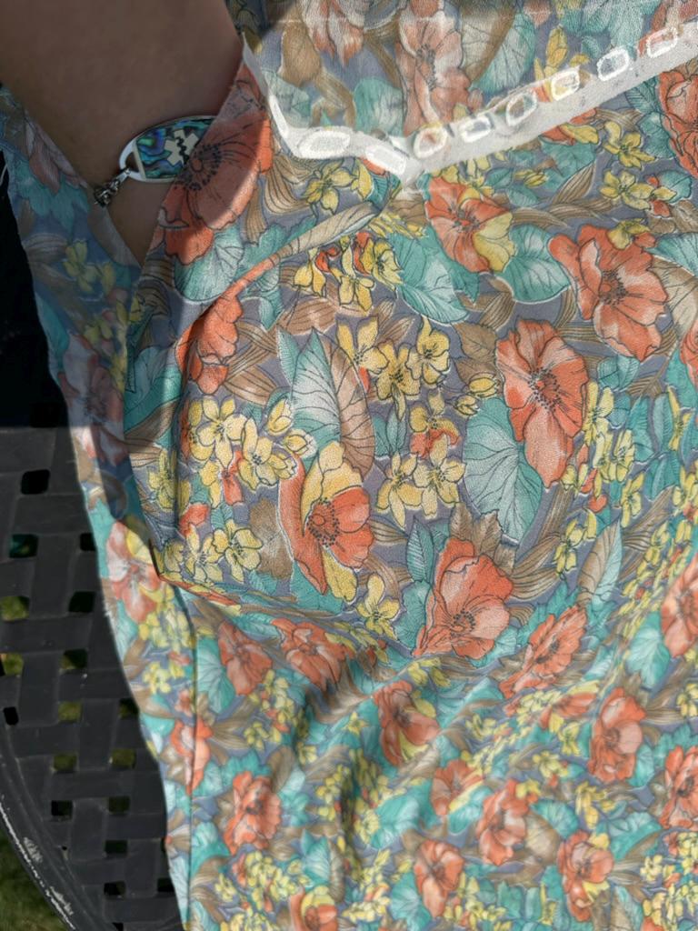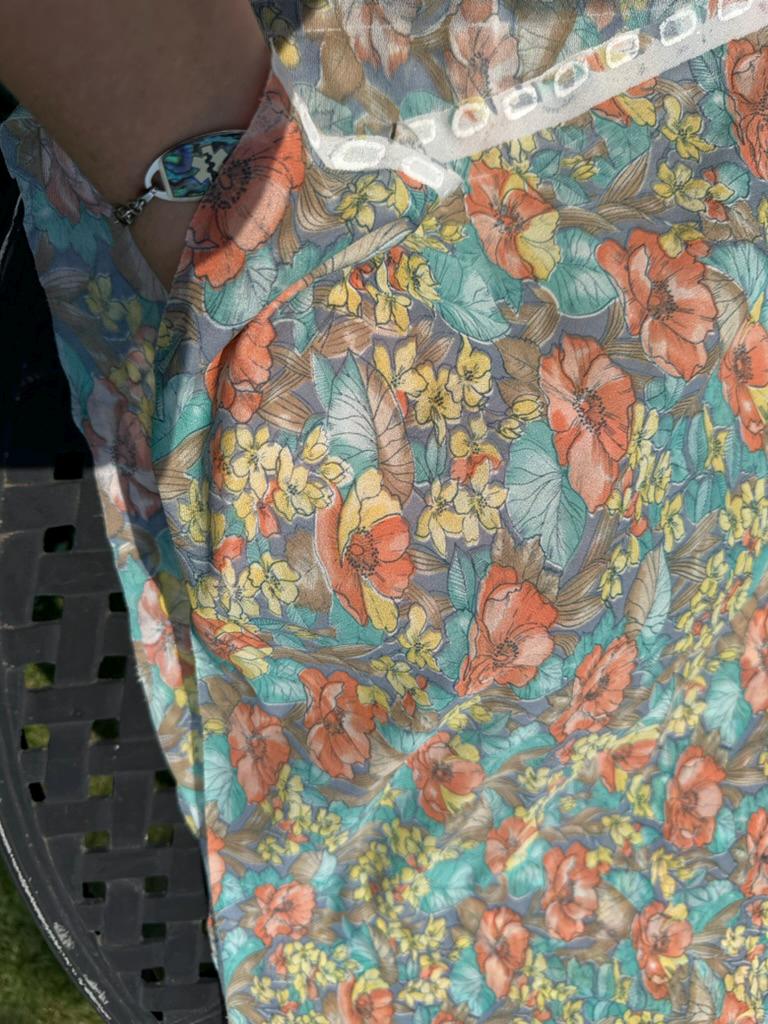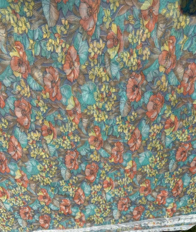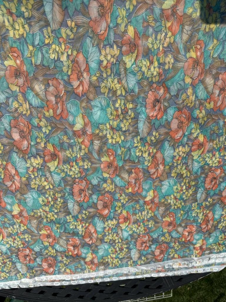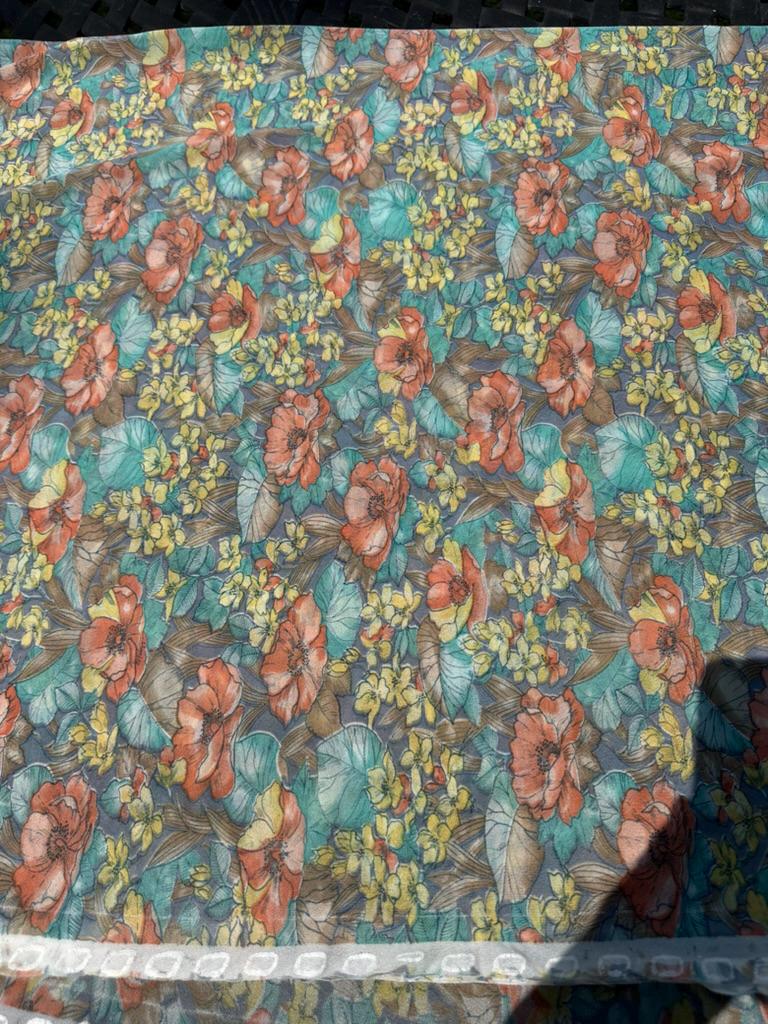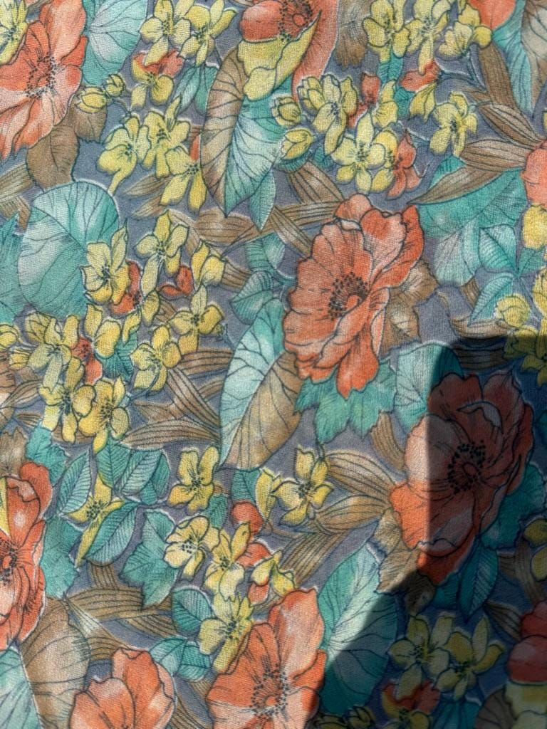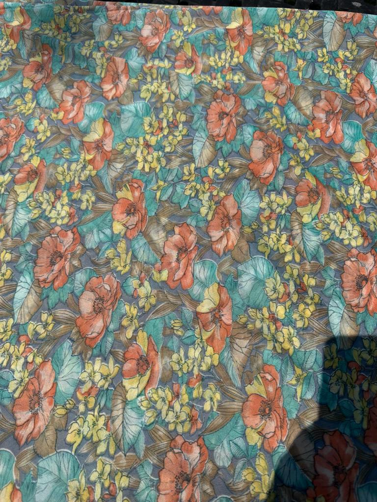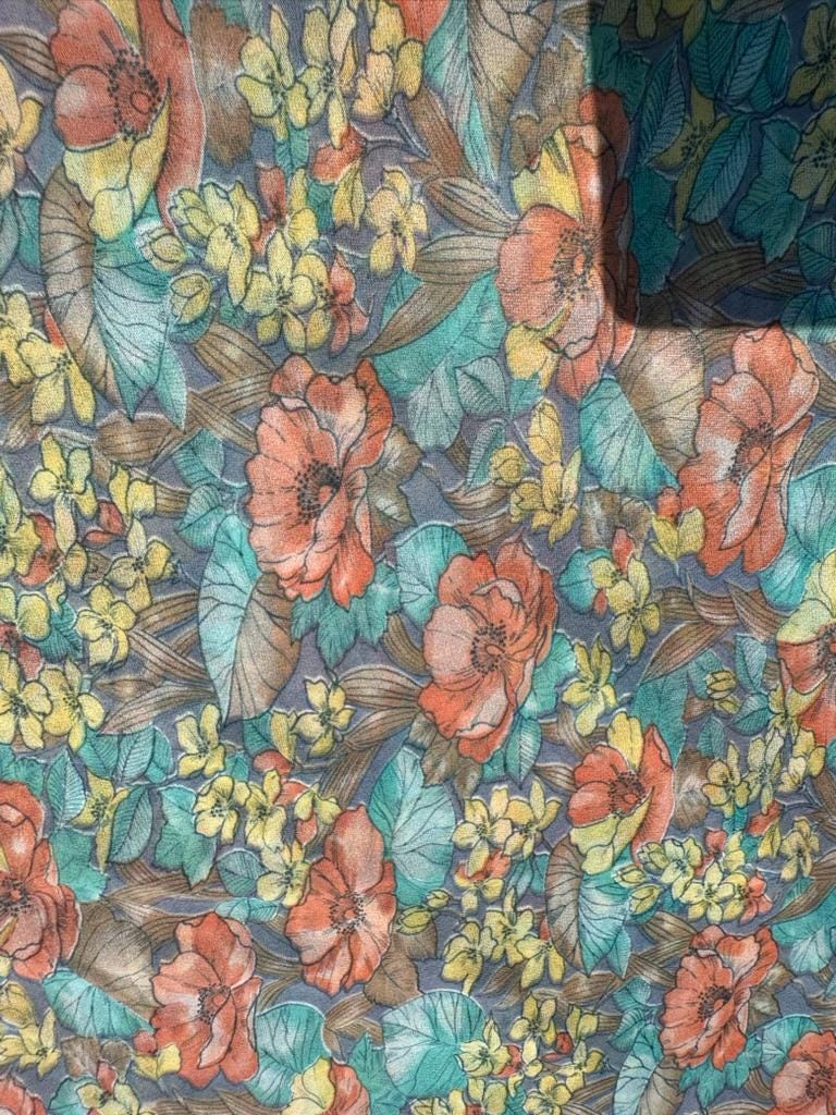 Vintage - gorgouse Yellow and Coral - Poppy flowers on a Blue/Gray background 1980's. Polyester Georgette Fabric