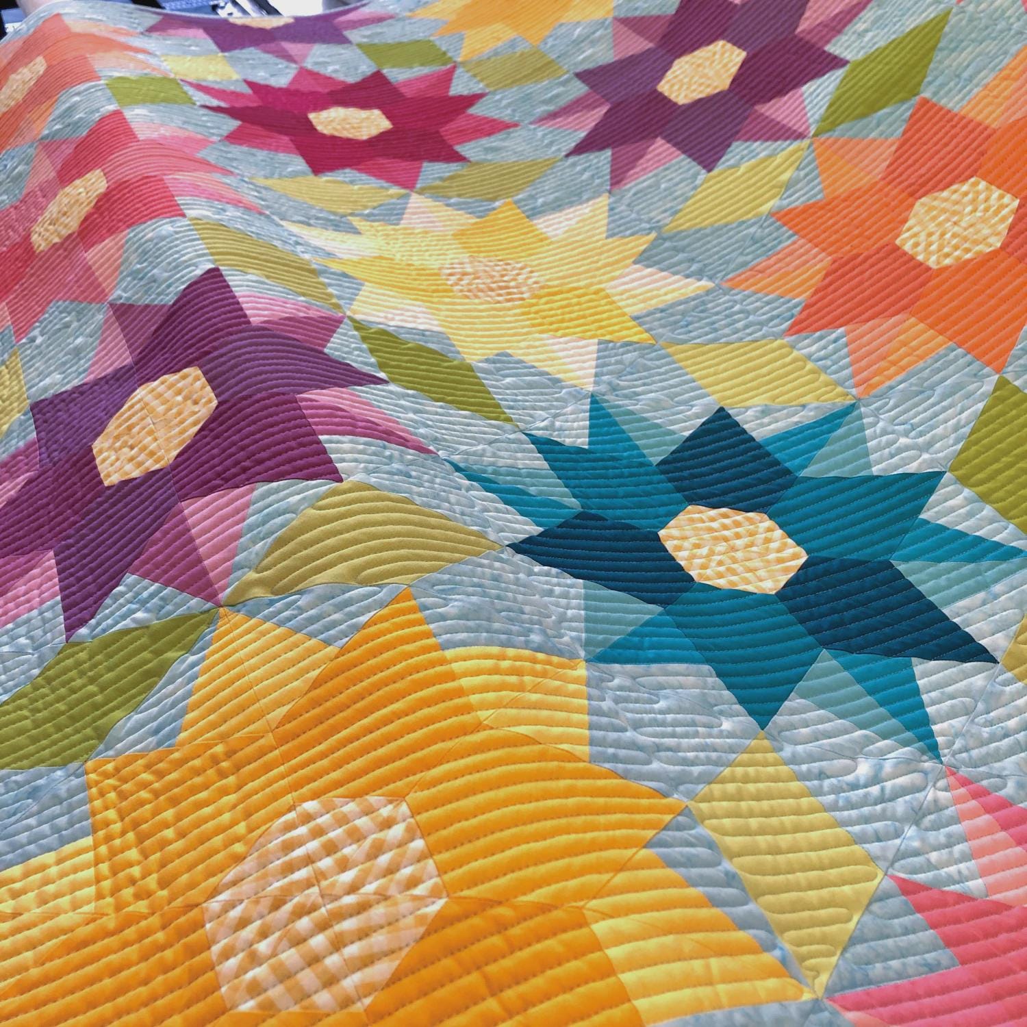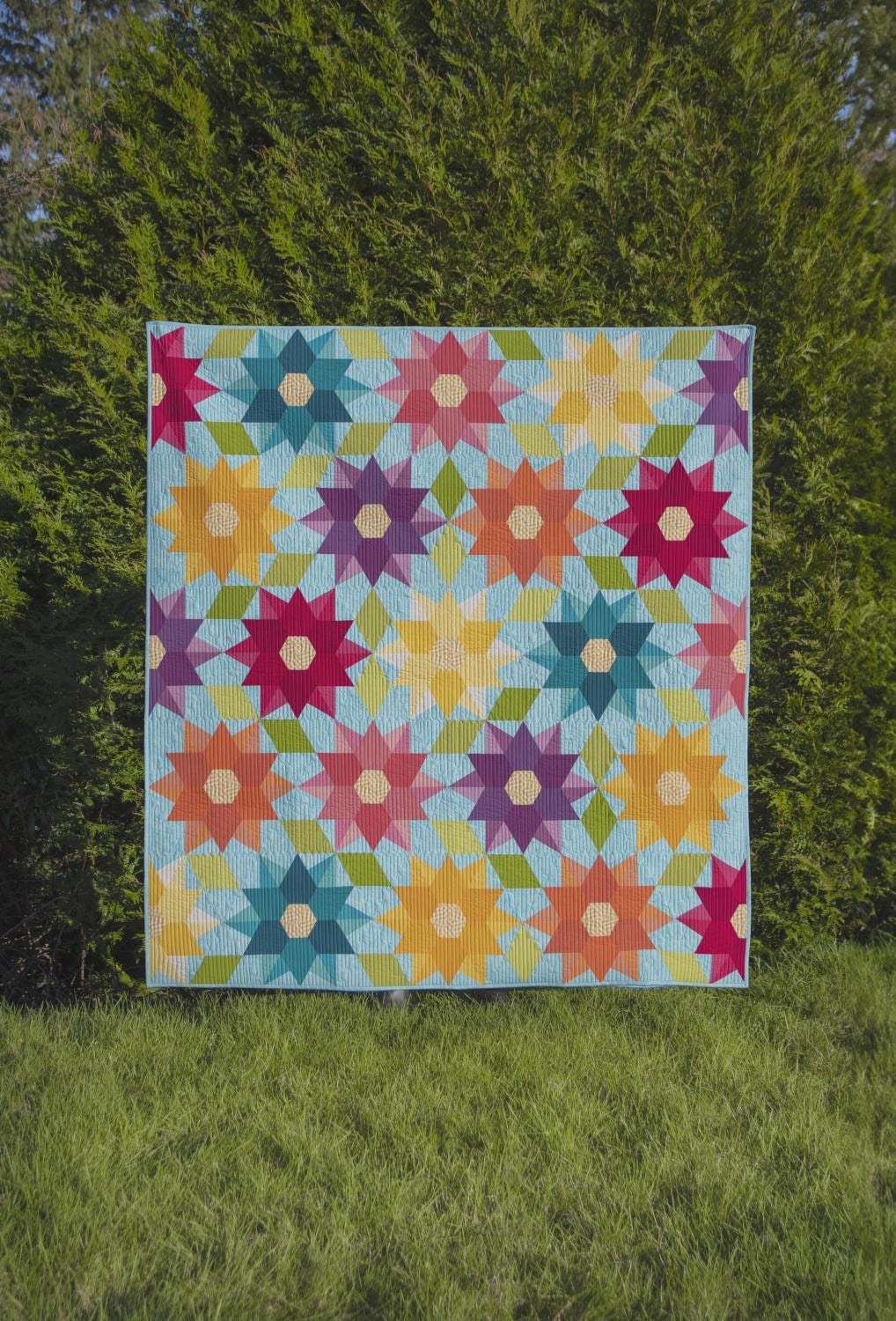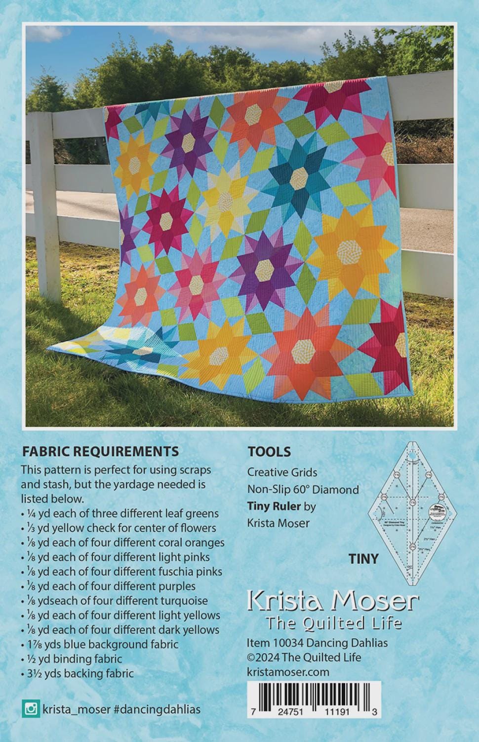 Gain confidence with angles and color placement, plan out curated flower shades, or use scraps from your stash for an eclectic look! Dancing Dahlias will give you a complicated look without tedious piecing. It is constructed of two main blocks, the flower blocks, and the leaf blocks, with side setting units that make construction a breeze with no Y seams. Each block illustrates a different technique using the Creative Grids 60-Degree Diamond TINY Ruler.