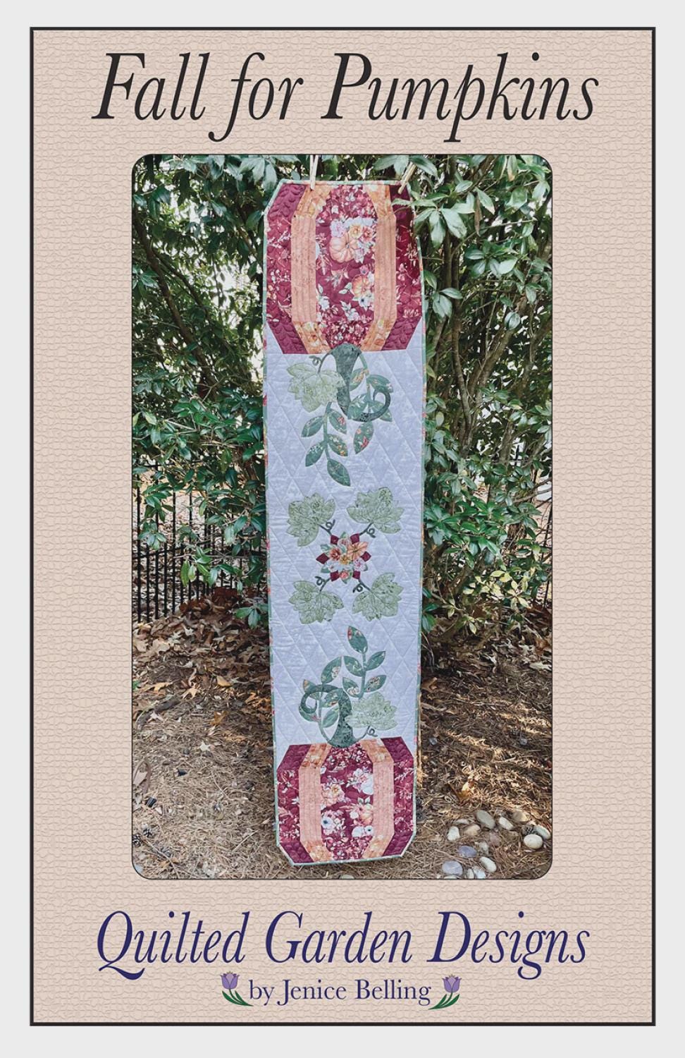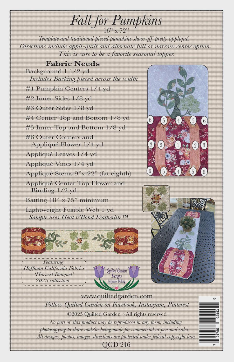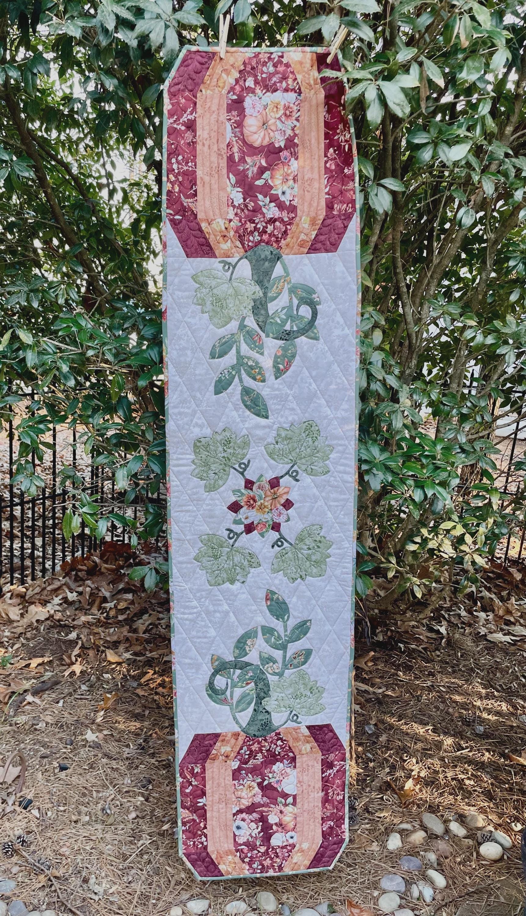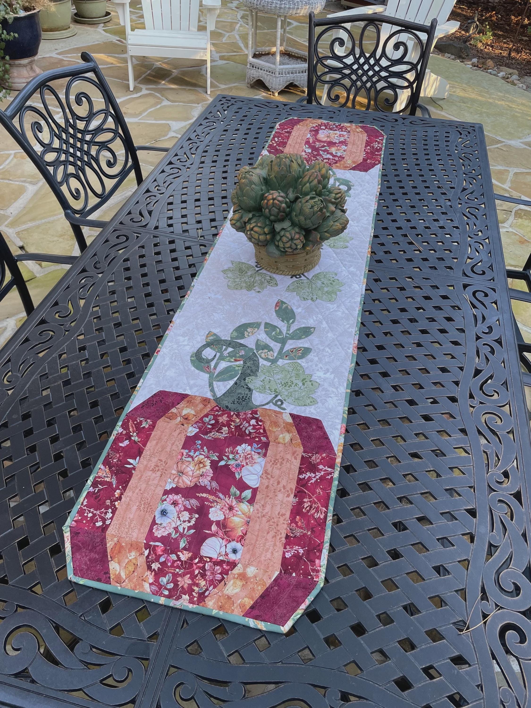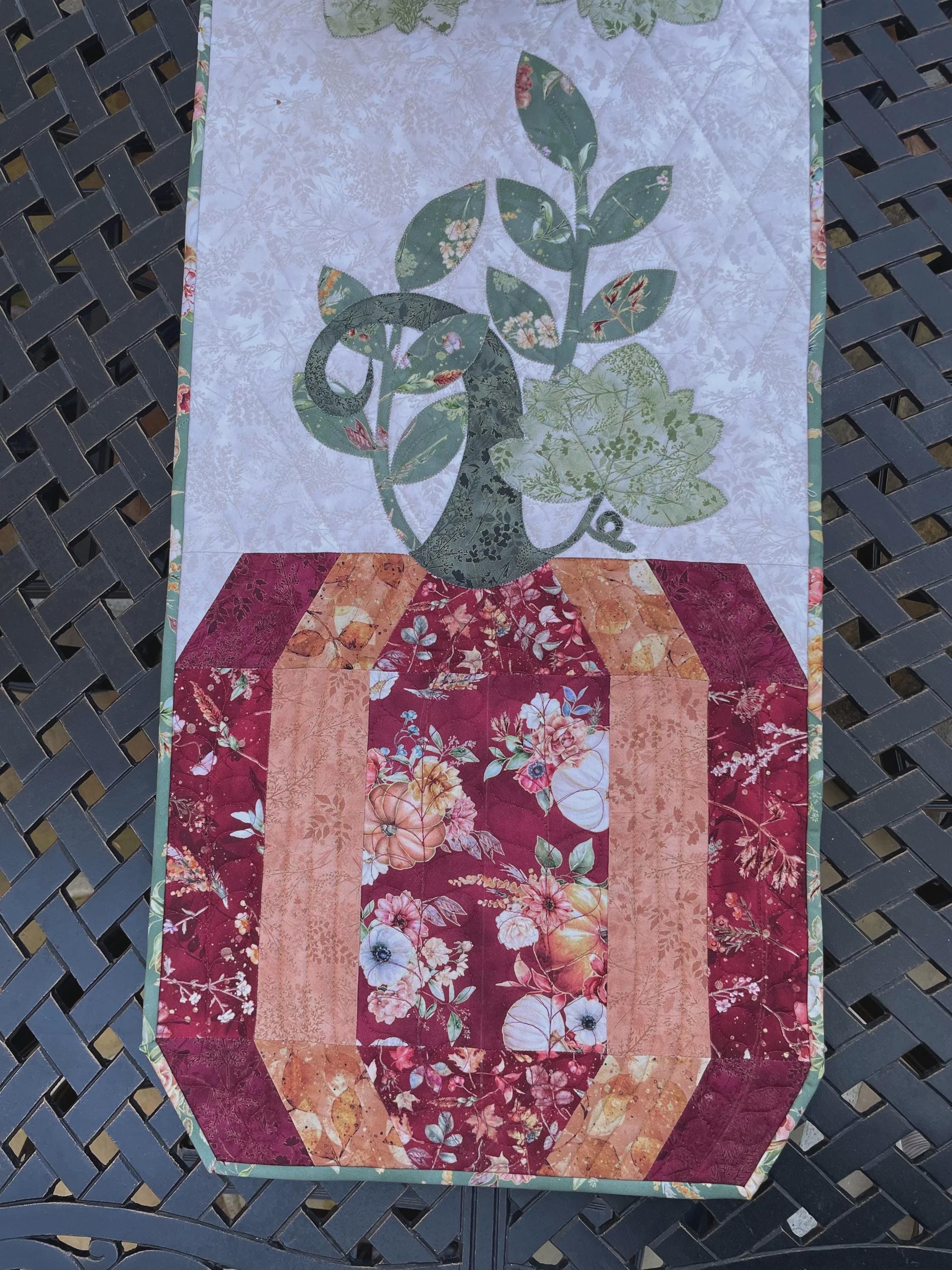 Template and traditional pieced pumpkins show off pretty appliqué. Directions include appli-quilt and alternate full or narrow center option. This is sure to be a favorite seasonal topper.