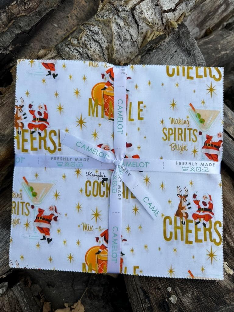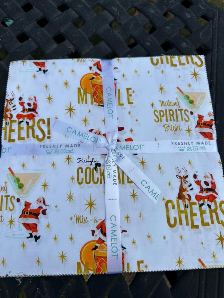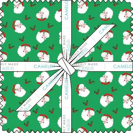 This vibrant fabric features a festive design with a green background adorned with playful Santa Claus faces, holly leaves, and candy canes. The pattern is lively and perfect for holiday-themed projects, offering a cheerful and whimsical touch to any creation. The fabric squares are neatly packaged with a ribbon, adding an extra charm to the presentation.