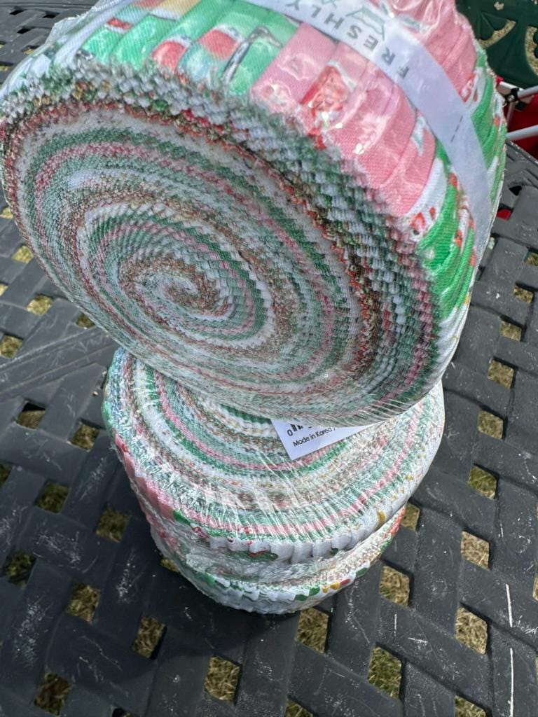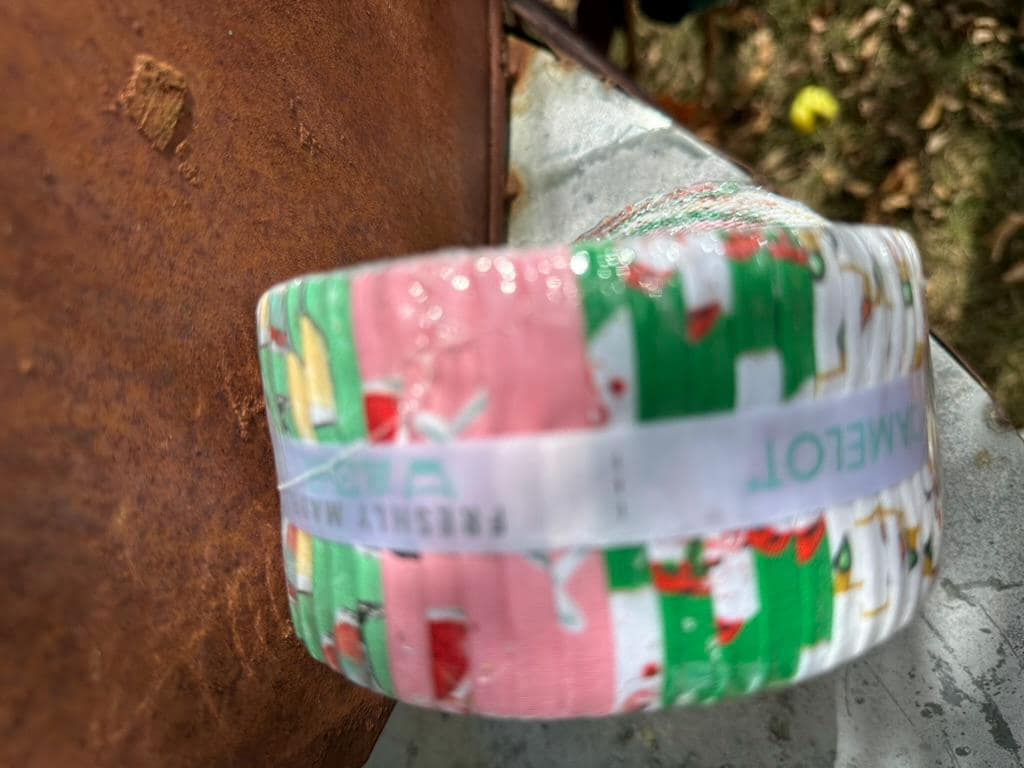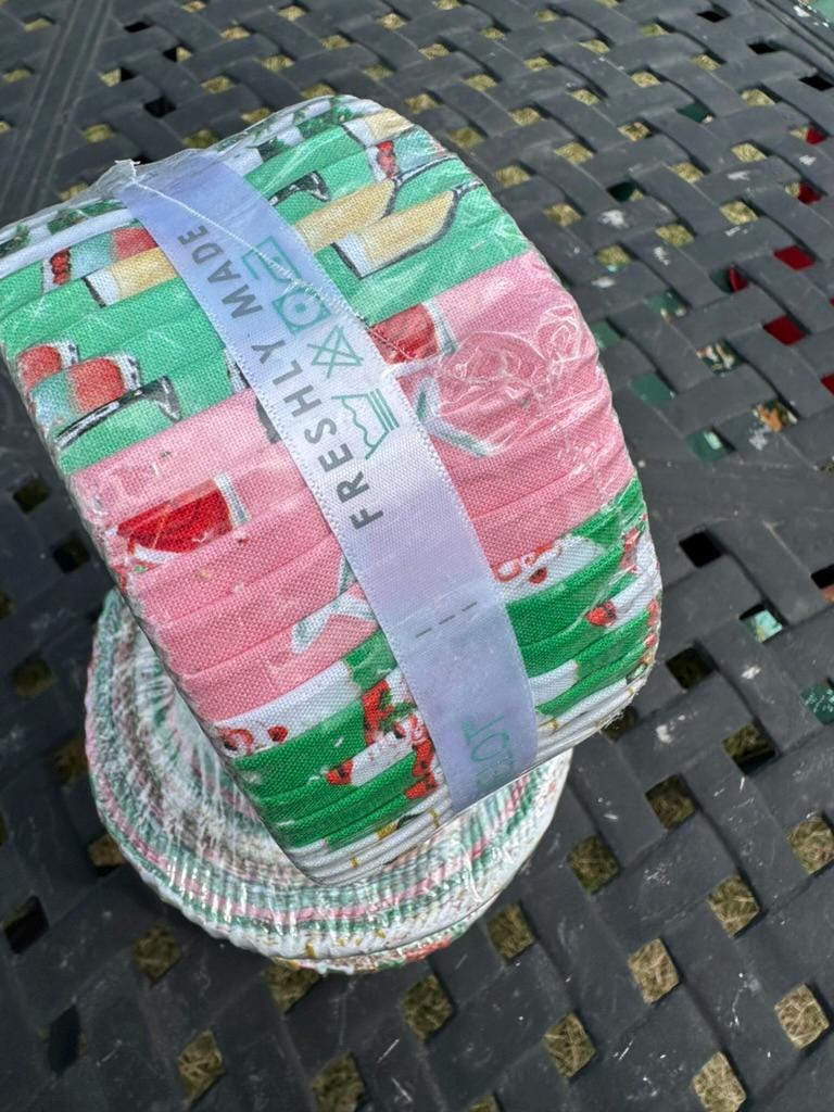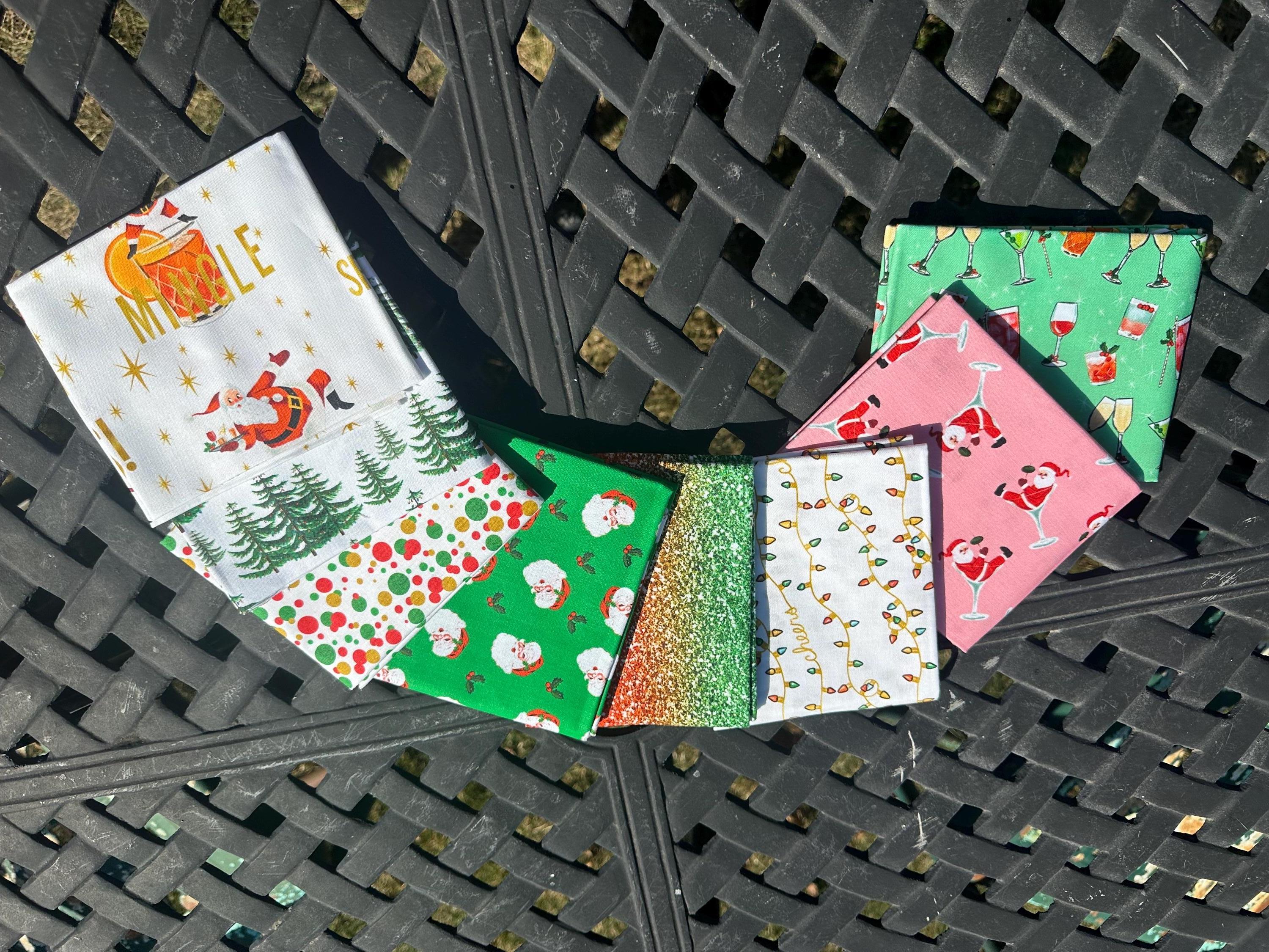 This vibrant fabric features a festive design with a green background adorned with playful Santa Claus faces, holly leaves, and candy canes. The pattern is lively and perfect for holiday-themed projects, offering a cheerful and whimsical touch to any creation. The fabric squares are neatly packaged with a ribbon, adding an extra charm to the presentation.