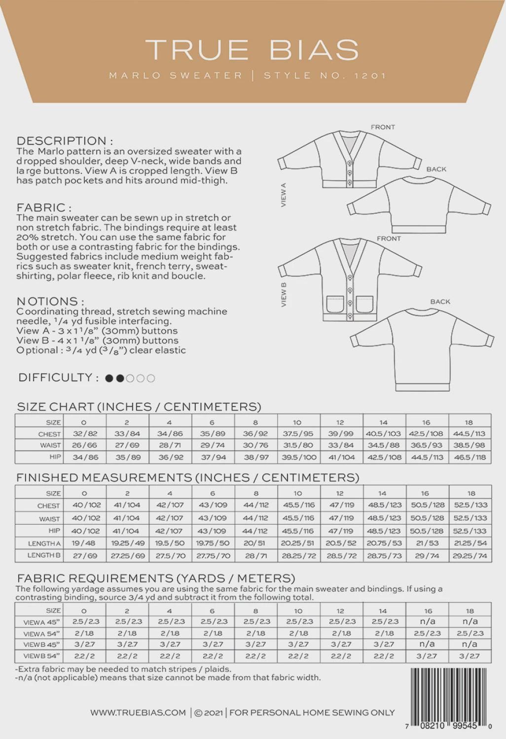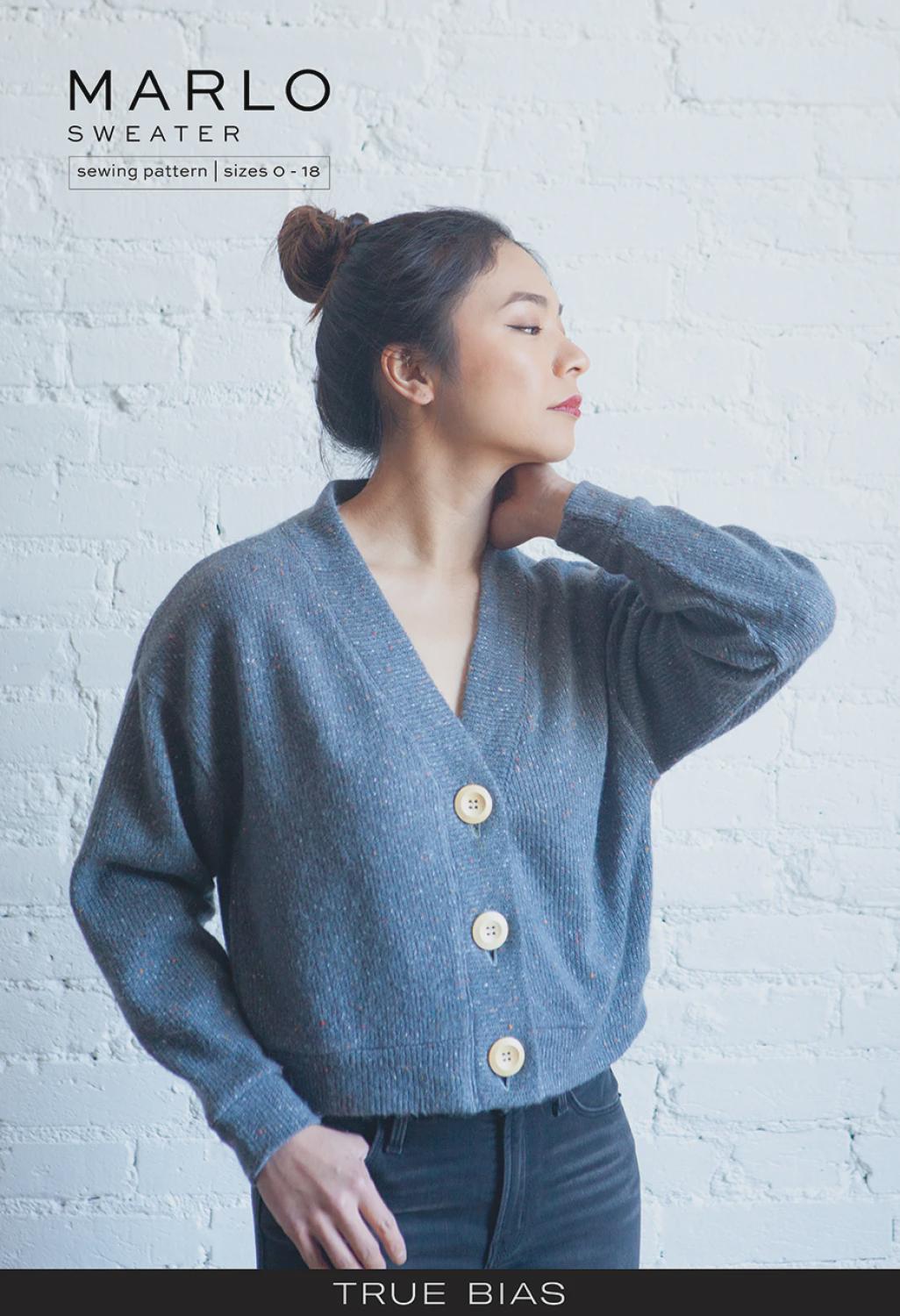 The Marlo pattern is an oversized sweater with a dropped shoulder, deep V-neck, wide bands and large buttons.