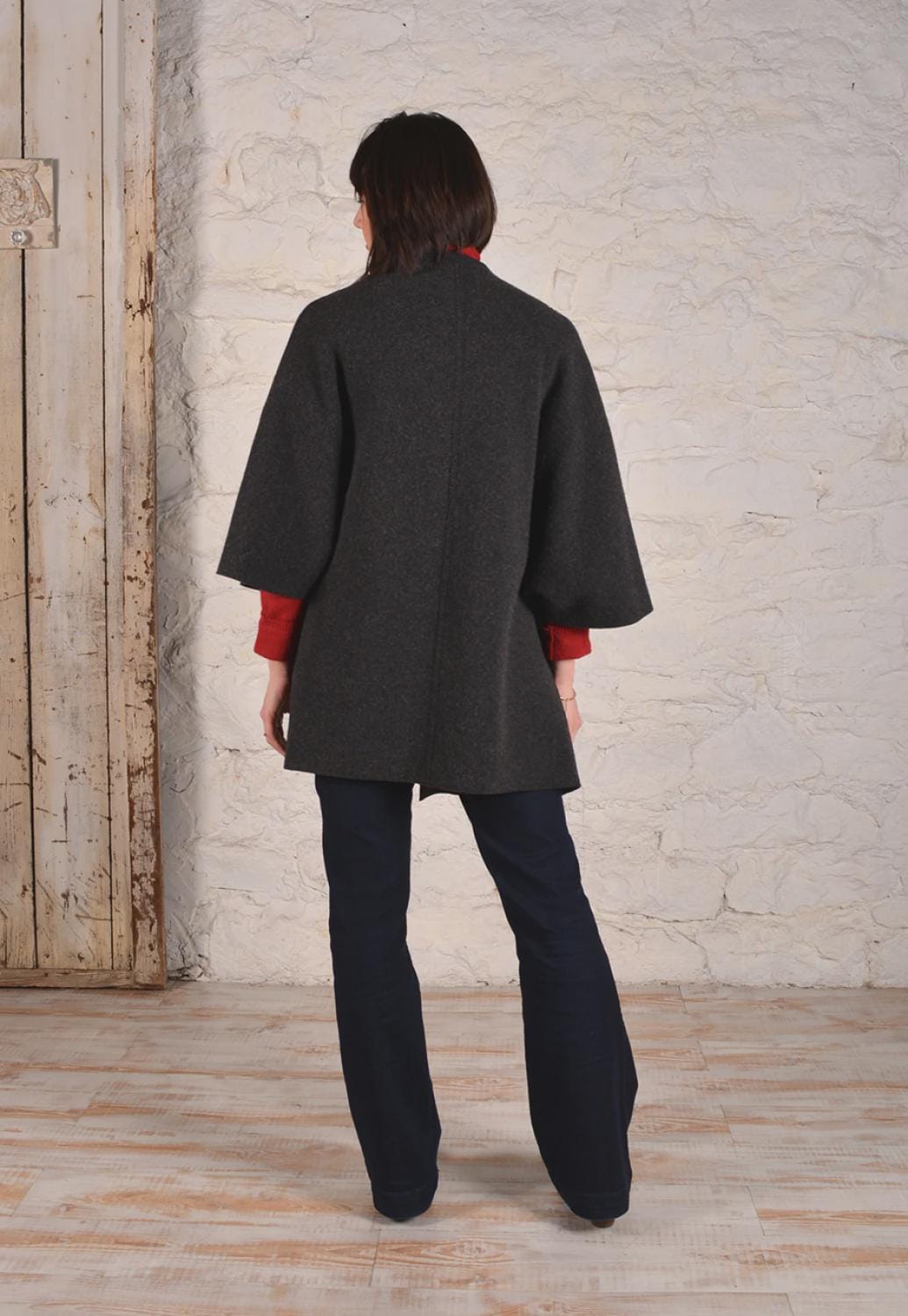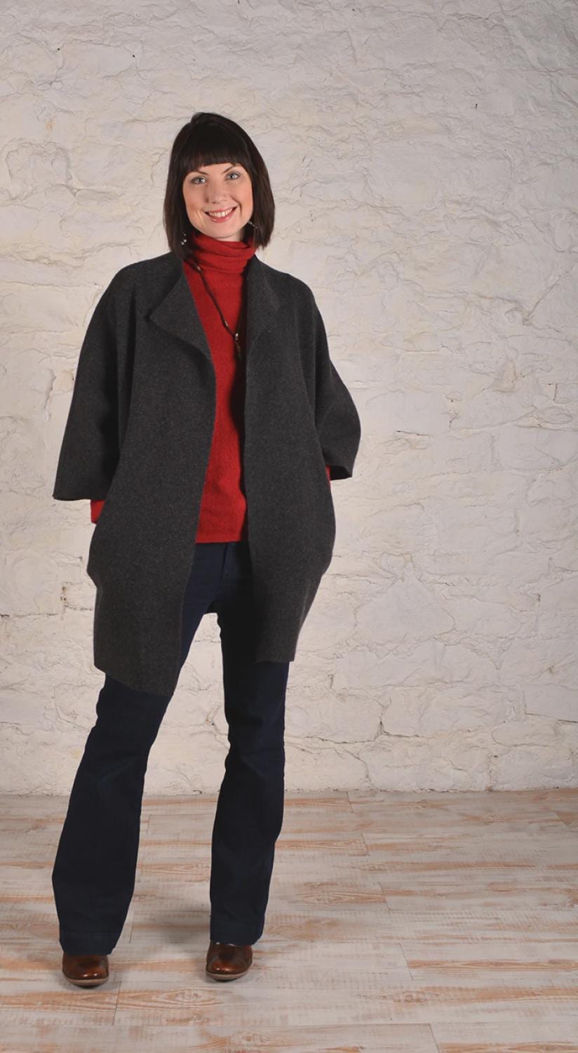 "Coat Loose-fitting, open-front coat with dolman sleeves and front slit pockets. Raw edges, lap seam construction.