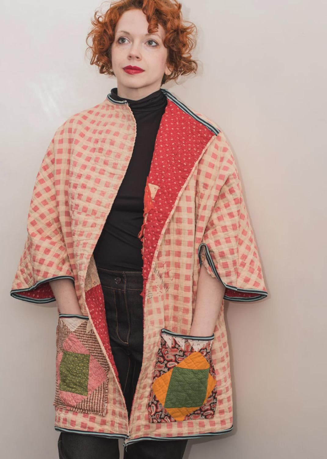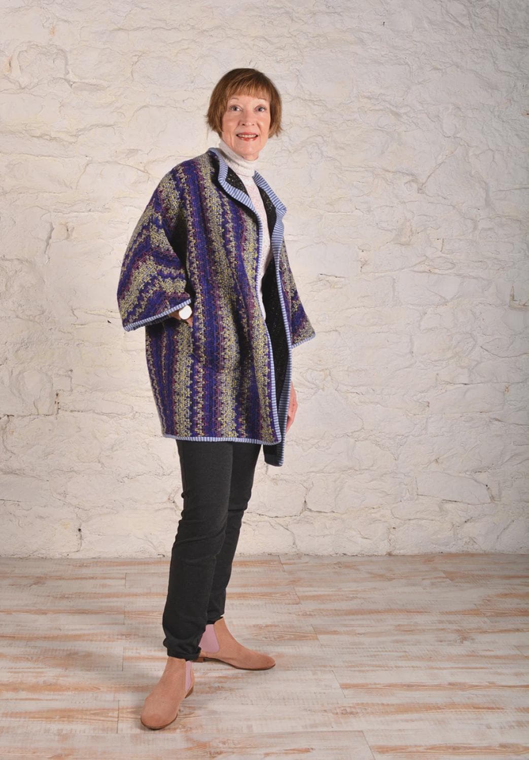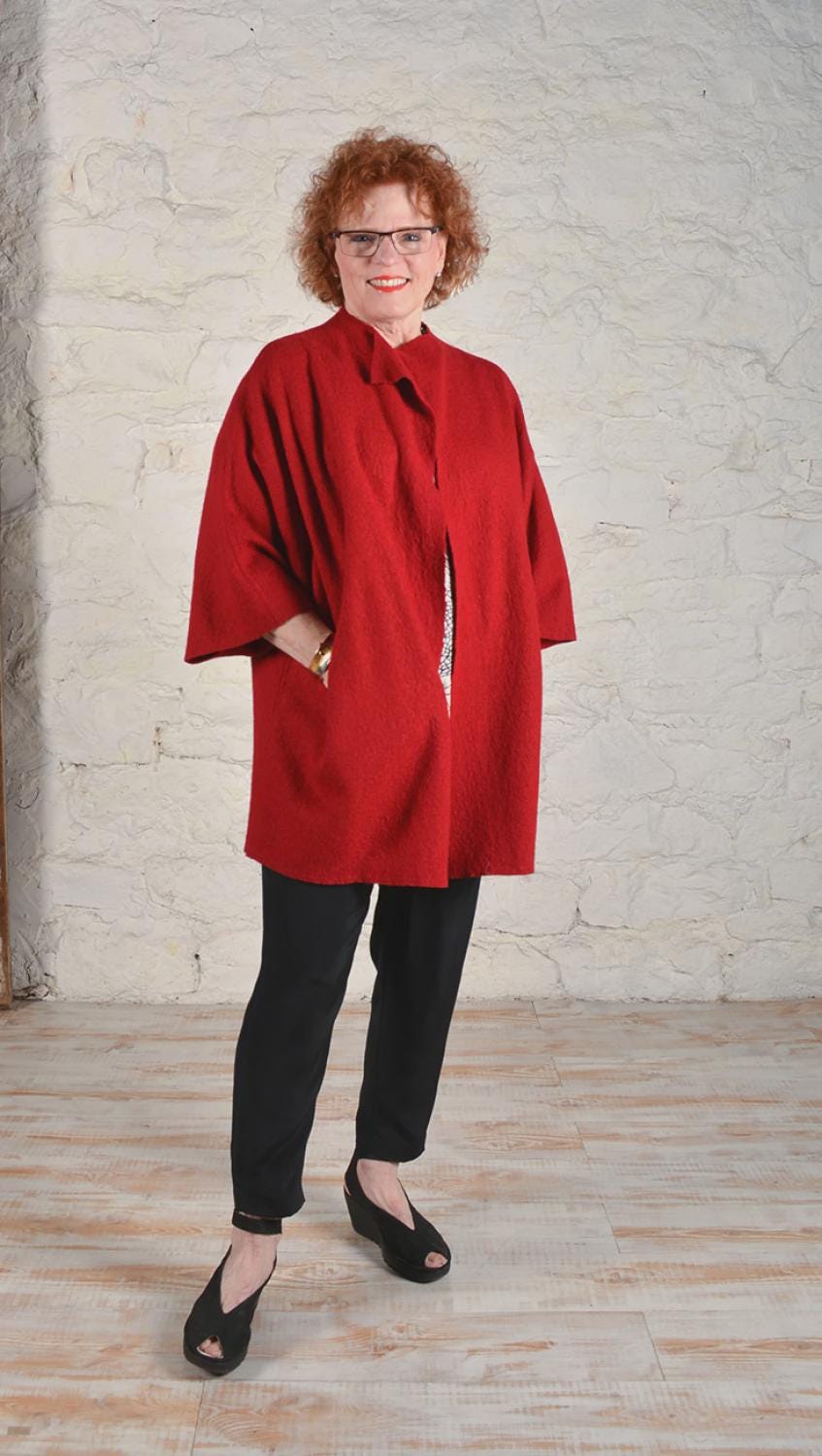 Medium to heavy-weight no-fray fabrics such as wool melton, felled wool, neoprene, scuba, suede or faux suede. Instructions included for knit binding and patch pockets when using fabrics that fray.