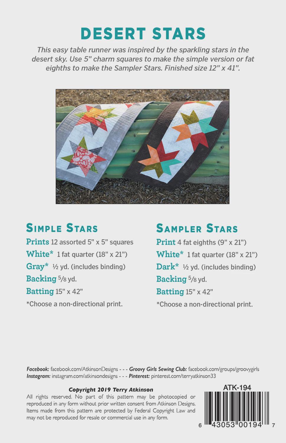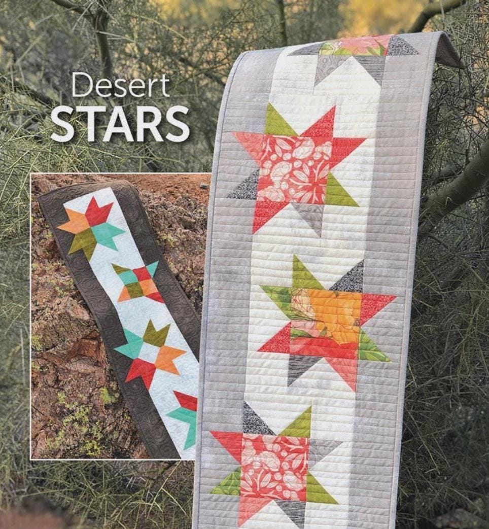 Inspired by the twinkling stars in the desert sky, this Desert Stars table runner pattern brings a touch of celestial beauty to your home decor. Crafted with vibrant charm squares or fat eighths, this pattern allows you to create either simple stars or a sampler of various star designs. The finished runner measures 12 inches by 41 inches, making it an ideal centerpiece for your dining table. The design features a series of colorful stars in red, white, blue, and orange, set against a neutral background, providing a striking contrast that mimics the night sky. This project is perfect for those who enjoy standard machine sewing and want to add a handmade touch to their living space.