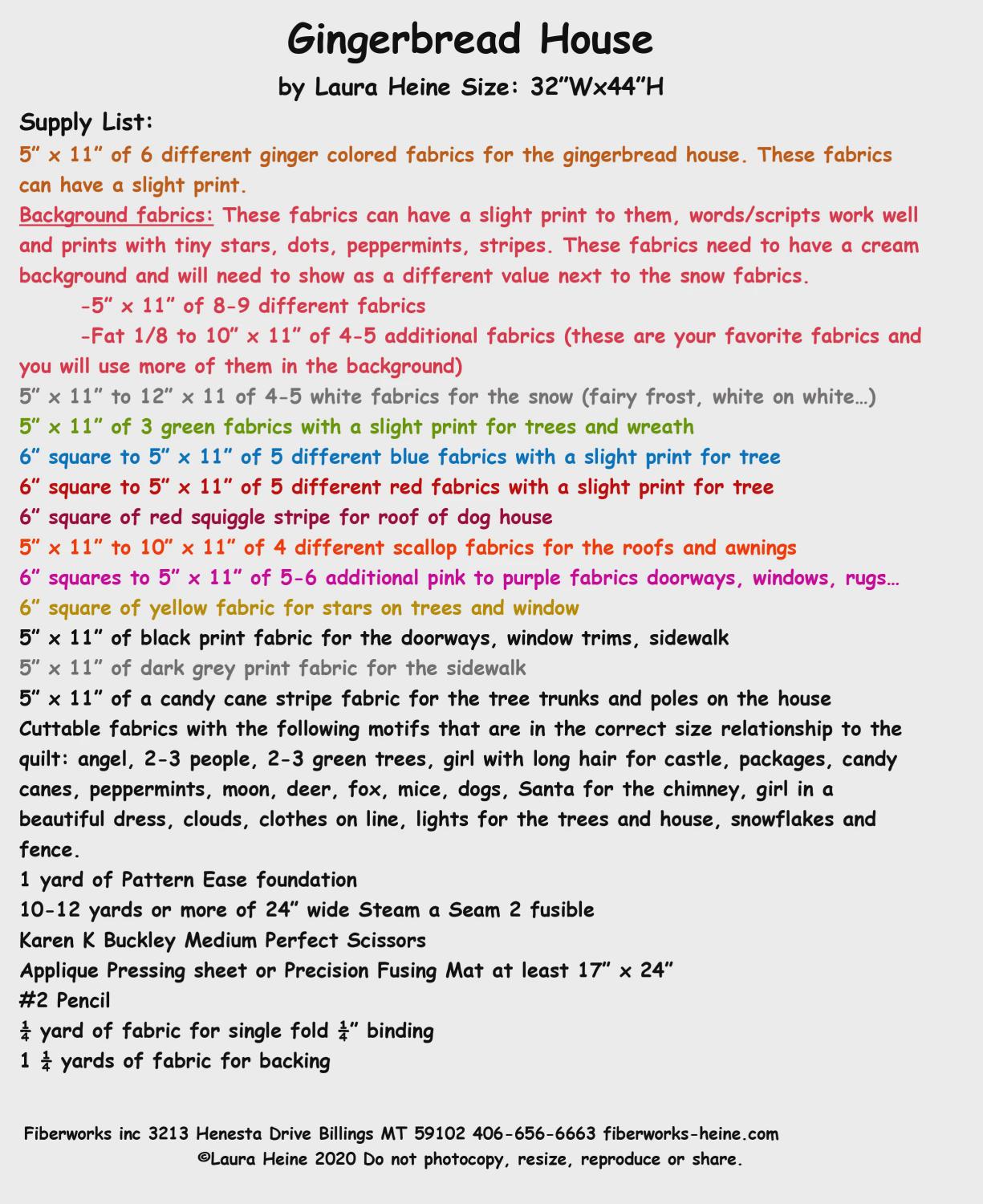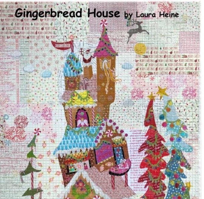 Discover the charm of creating your own whimsical gingerbread house with this delightful collage pattern designed by Laura Heine. This project features a colorful, enchanting house adorned with candy canes, gumdrops, and icing details, set against a backdrop of festive holiday trees, complete with ornaments and stars. The pattern includes a magical scene with a snowman and reindeer, bringing a winter wonderland to life. Perfect for quilters and fabric artists, this pattern provides detailed color step-by-step instructions and a full-size layout, ensuring your project turns out just as magical as the design. The finished size of this festive creation is an impressive 32x44 inches, making it a standout piece for holiday decor or a unique gift.