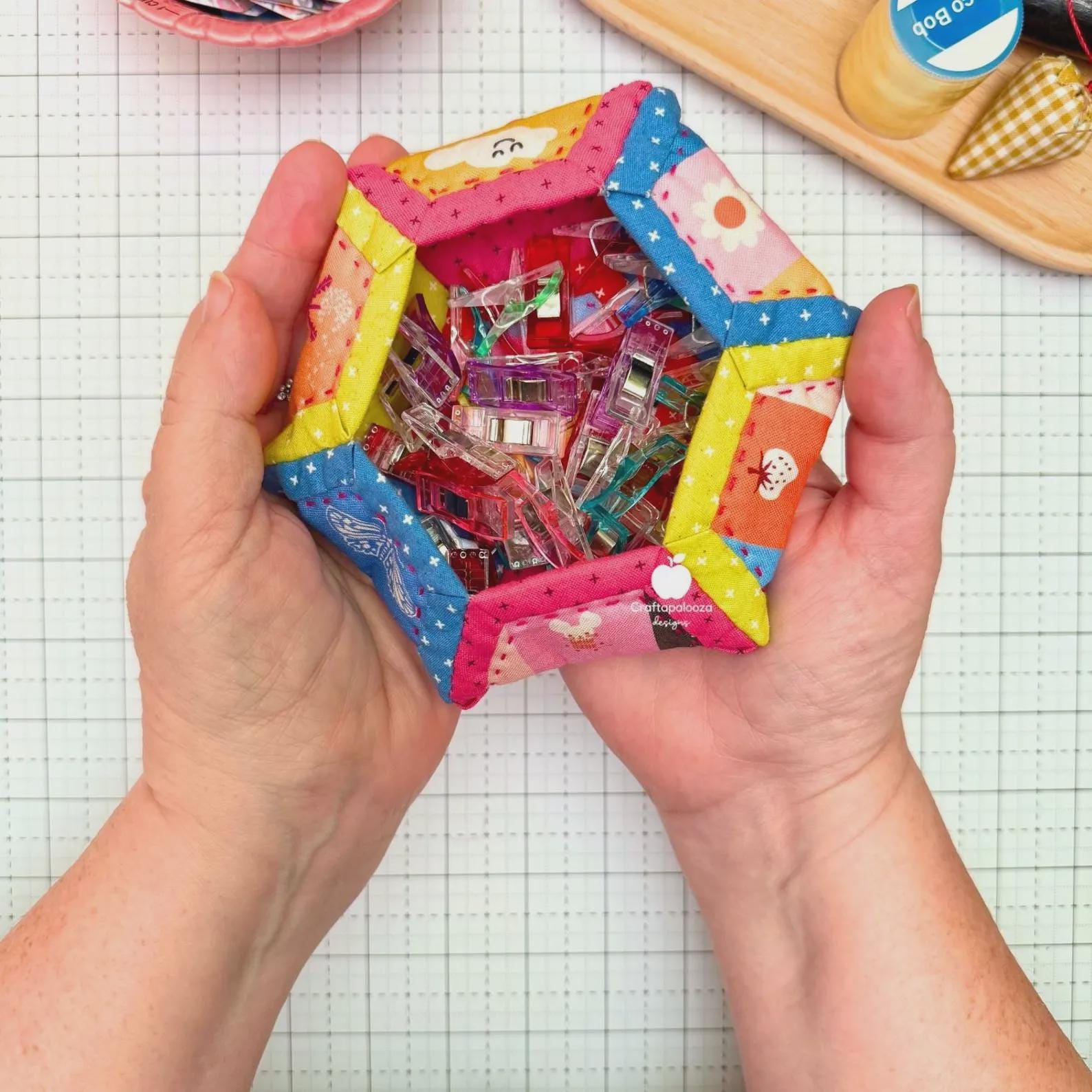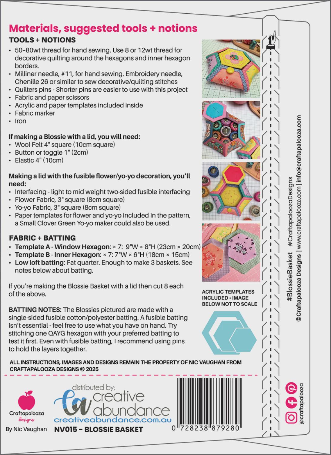 A scrappy little basket with a big personality! The Blossie Basket is a joyful quilt-as-you-go (QAYG) hexagon project that turns fabric into a functional, hand-stitched treasure. Designed for makers who love slow stitching and clever construction, this charming basket can be sewn with or without a lid - offering multiple ways to personalise and play. The optional lid doubles as a handy needlekeeper, making Blossie as practical as it is adorable. It's perfect for storing threads, notions, or small keepsakes, and the petite size makes it a fun weekend make. Whether stitched in coordinated colours or a joyful riot of scraps, Blossie shines with hand-sewn detail. Suitable for confident beginners and seasoned sewists alike, this pattern is an excellent introduction to QAYG hexagons.