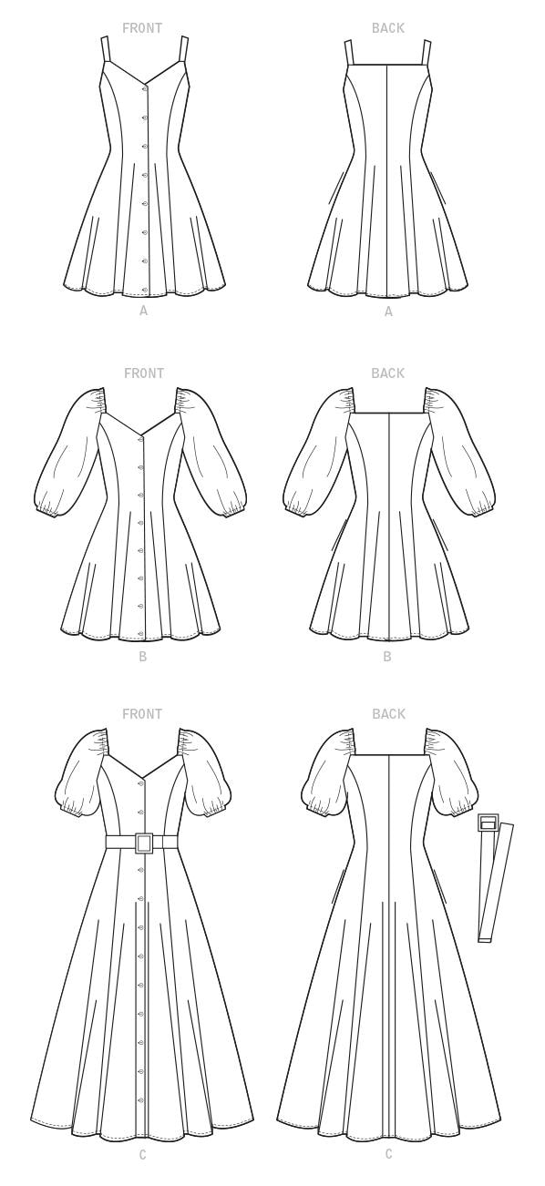 Princess seamed flared button dress. Views include straps, puff sleeve & belt. Short, midi & ankle lengths.