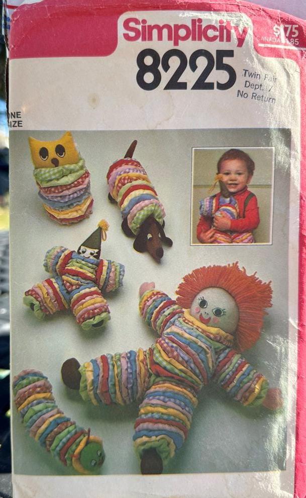 Simplicity 8225 Vintage Yoyo Stuffed Toy Dolls, Clown, Caterpillar, Dog, Owl, Uncut #N369
