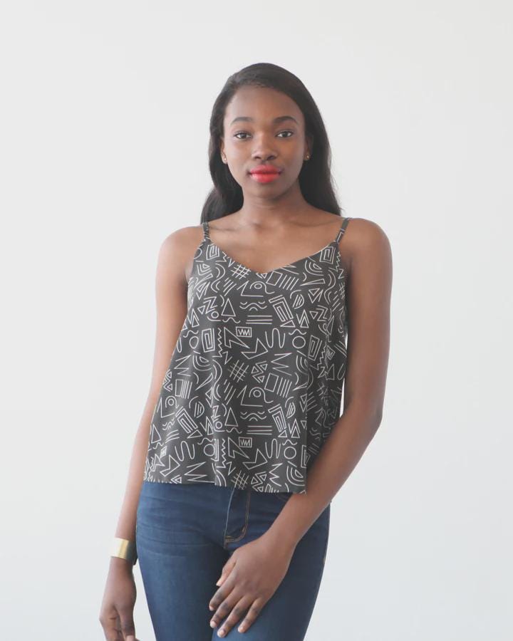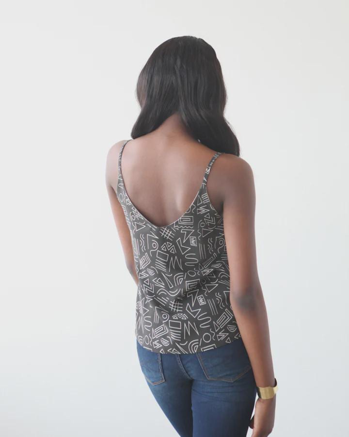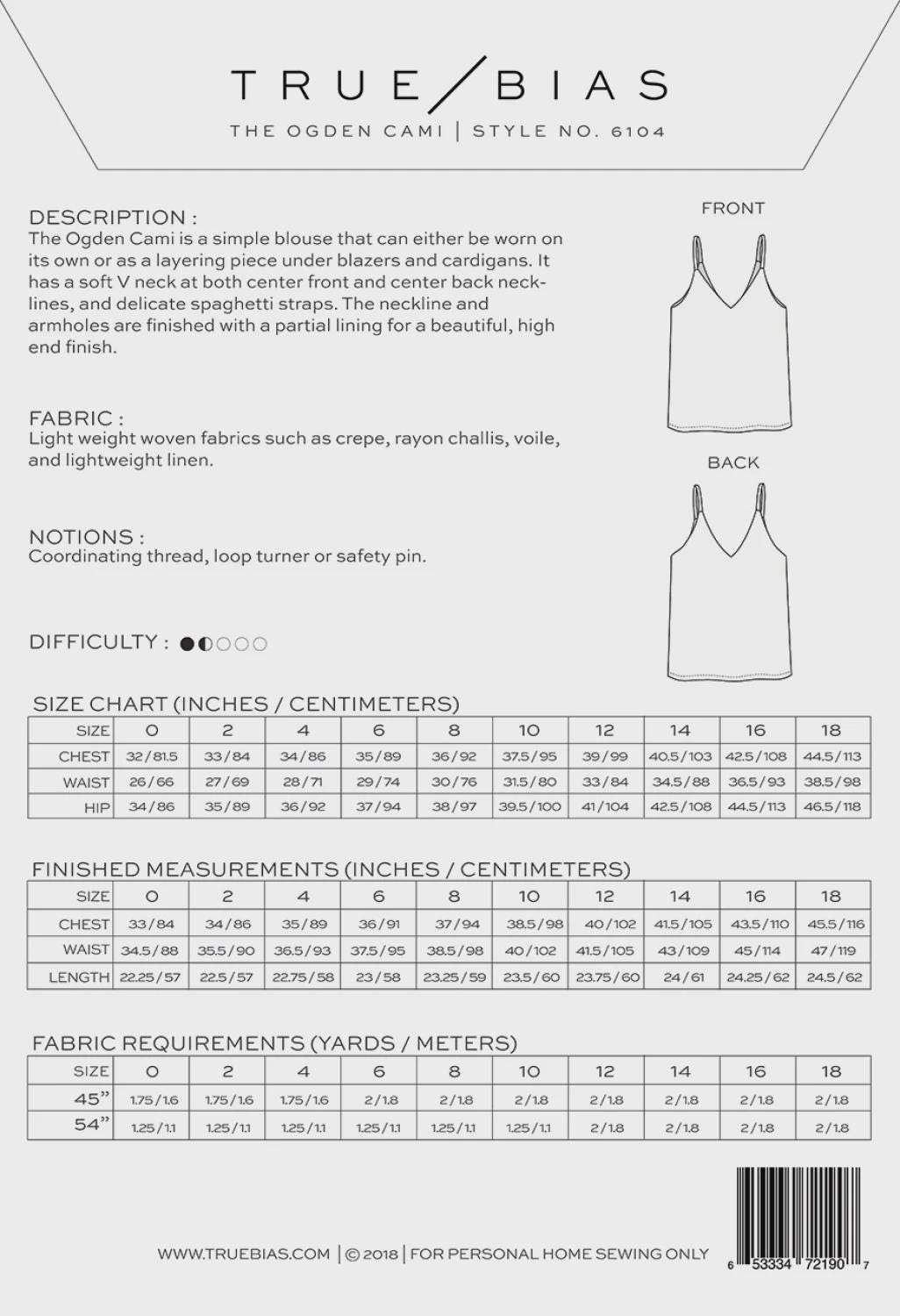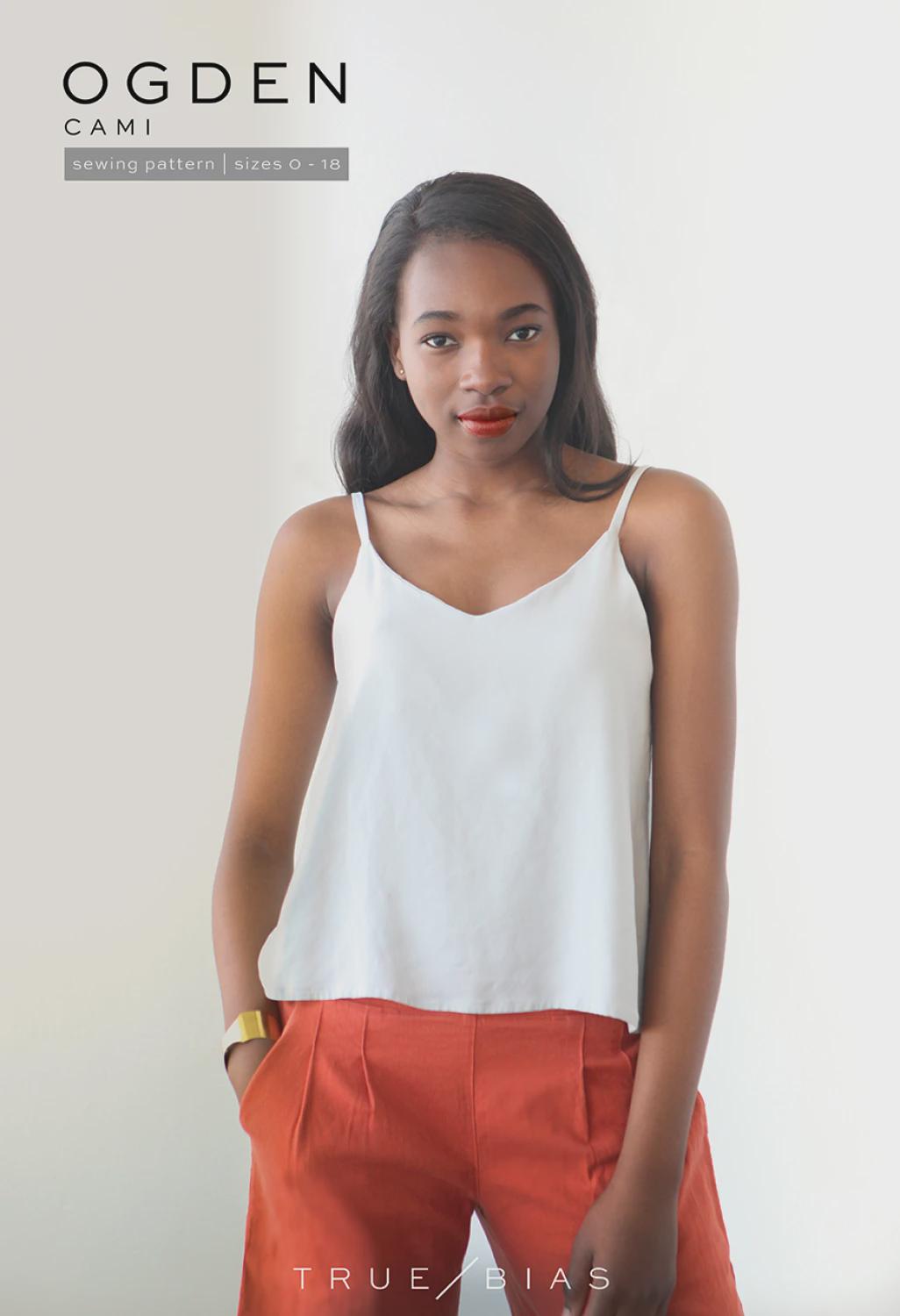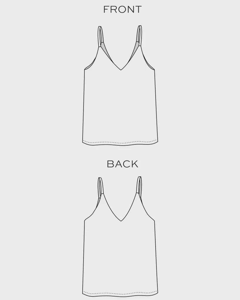 The Ogden Cami is a simple blouse that can either be worn on its own or as a layering piece under blazers and cardigans. It has a soft V neck at both center front and center back necklines, and delicate spaghetti straps. The neckline and armholes are finished with a partial lining for a beautiful, high end finish.