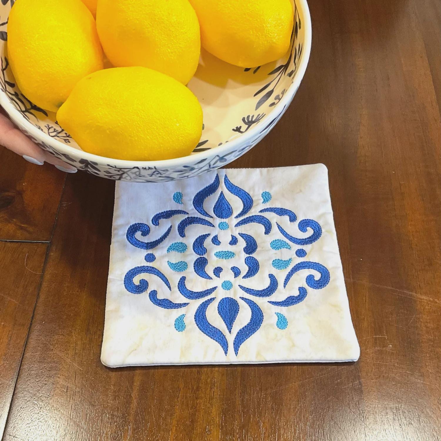 Requires a 6” x 6” stitch field Damask Trivet an “in the hoop” project