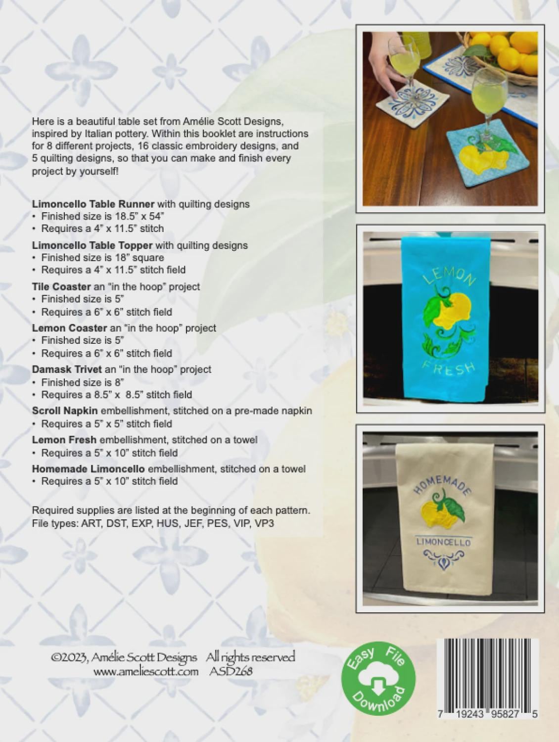 • Requires a 5” x 10” stitch field Homemade Limoncello embellishment, stitched on a towel