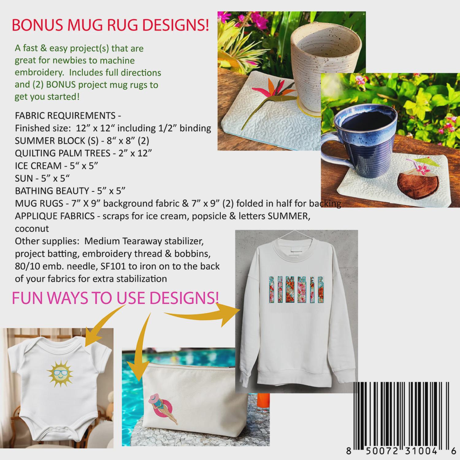 Create fun ways to use the designs: Summer Beach Bags Baby Clothing Accessory Bag Beach Shirt Beach Hat Plus TWO Bonus Mug Rug designs are included for you:) Whether you're looking to brighten a small corner, add a festive touch to your summer gatherings, or simply bring a smile to your face, our "Summer Vibes" mini quilt is the perfect choice.