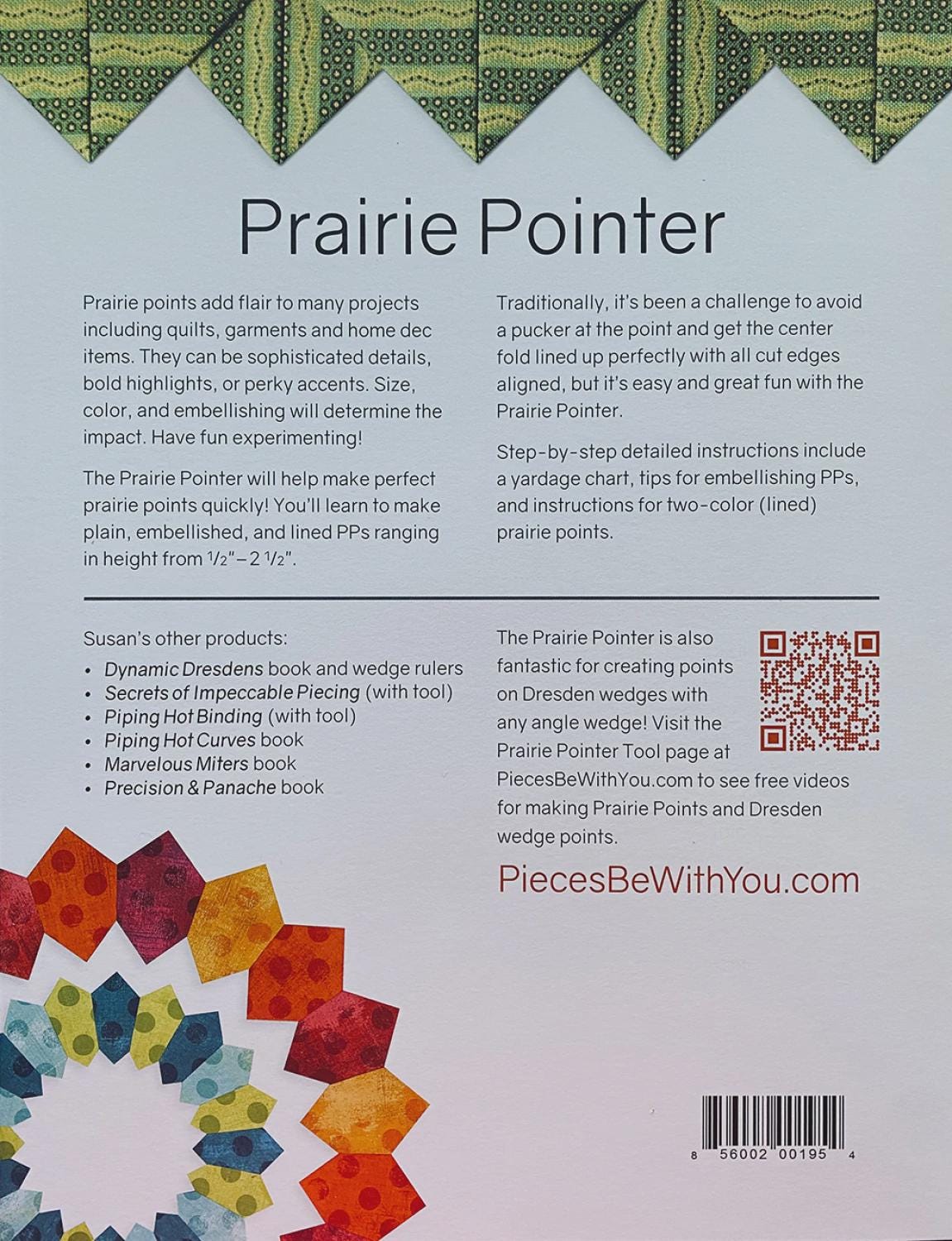 Making perfect prairie points has never been easier! Sometimes it's frustrating getting a sharp tip on a PP with all cut edges lining up perfectly, but the Prairie Pointer eliminates the frustration and produces perfect prairie points every time with a center fold, finishing from 1/2in up to 2 1/2in!