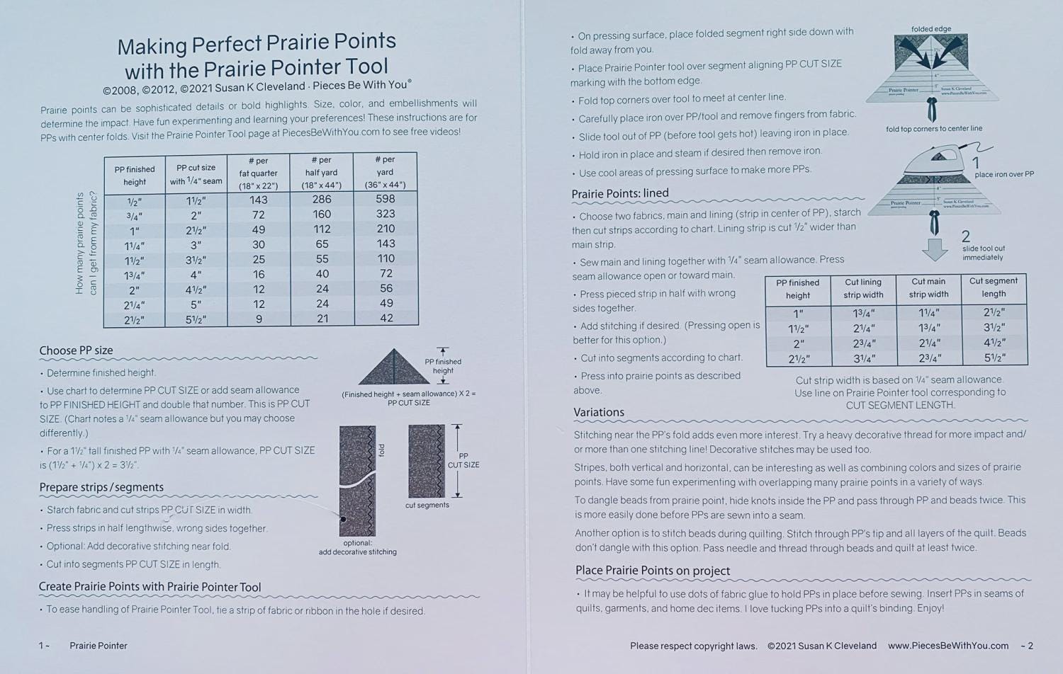 Detailed instructions for making prairie points including variations and suggestions for embellishments to spice things up even more. The packaging opens opens up to reveal lots of good info!