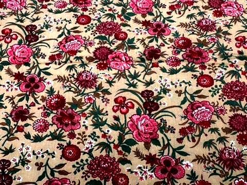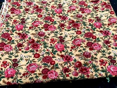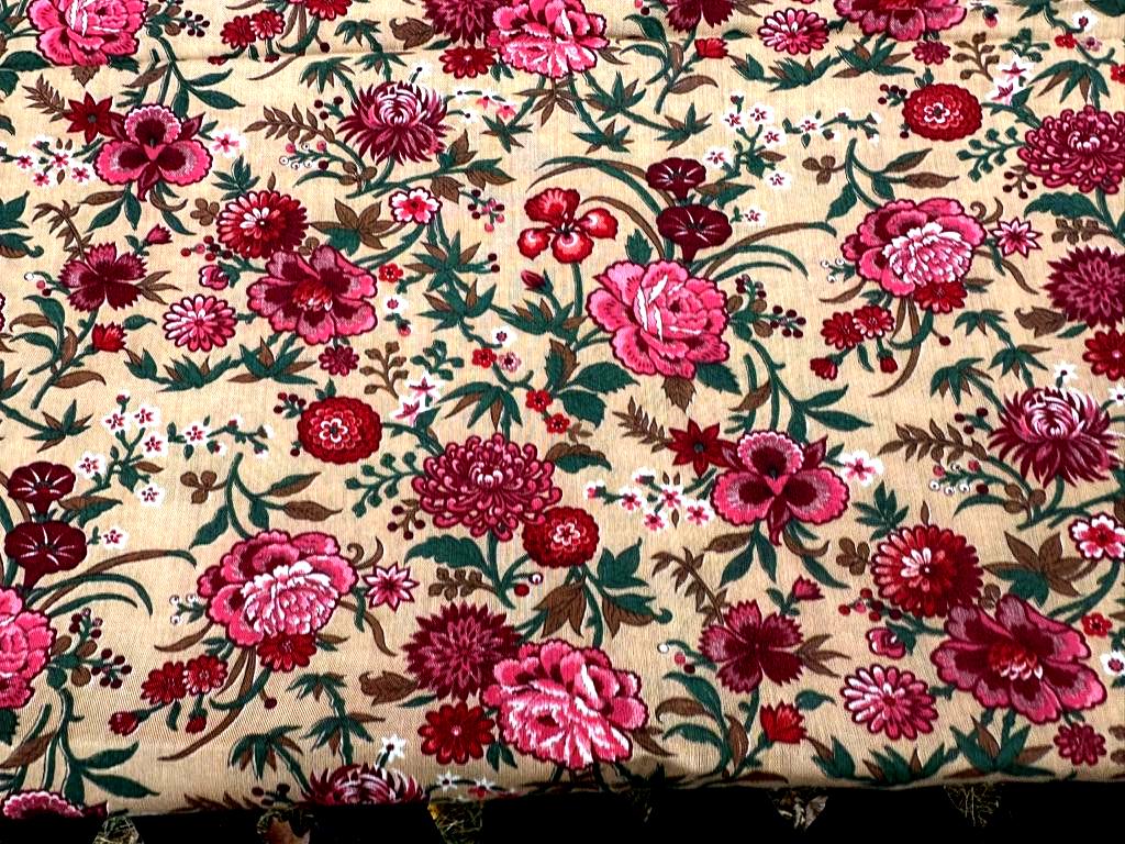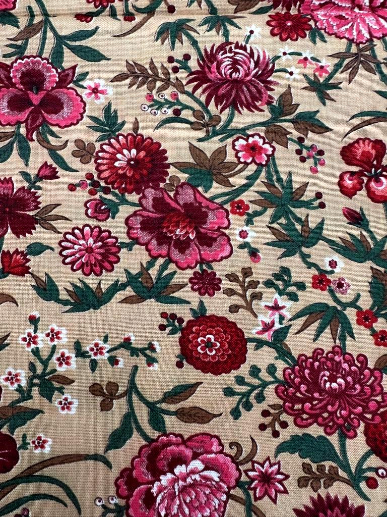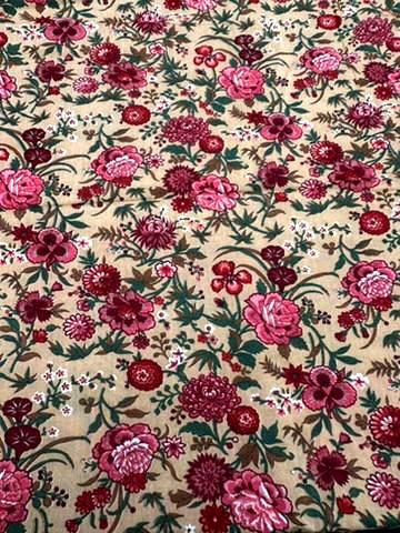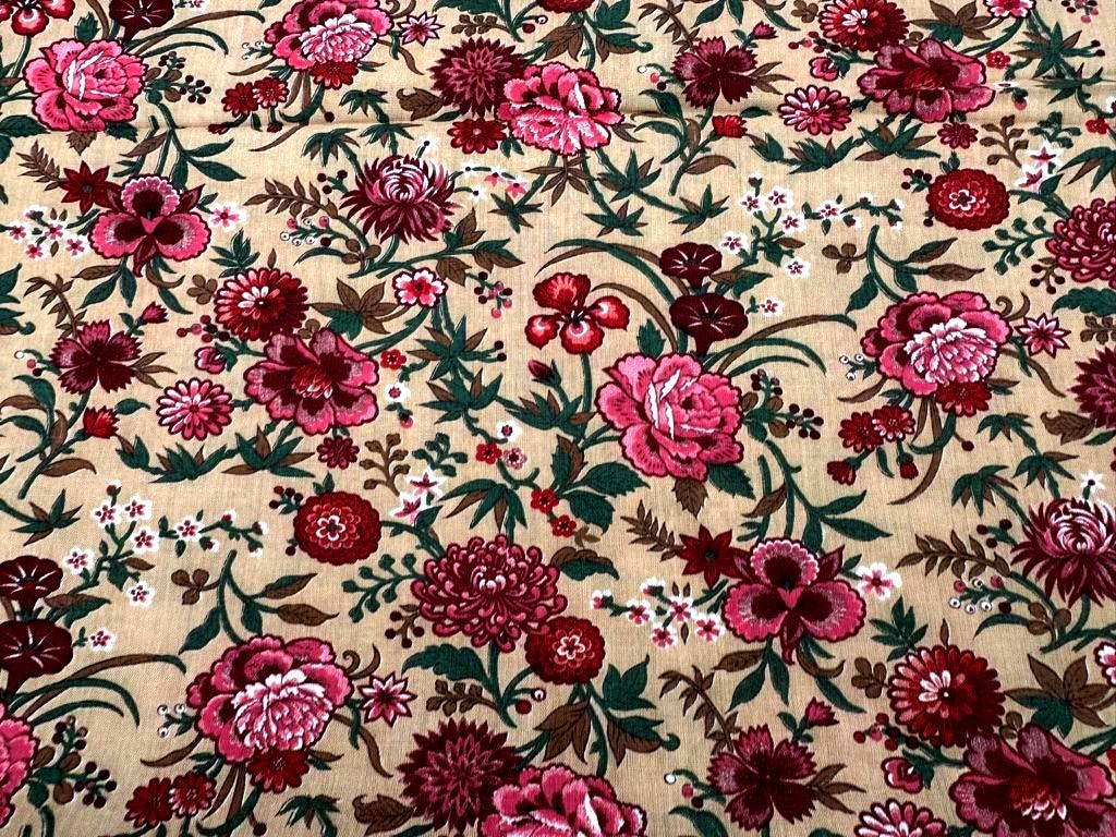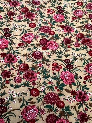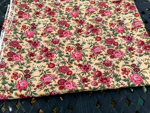 Vintage Cranston Print Works Cotton Blend fabric, featuring Tan Background with Red and Pink Flowers and Green Leaves. The background has what is called "Tea Dyed" Look