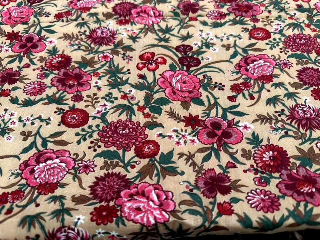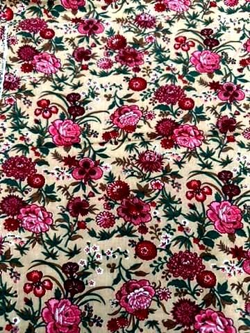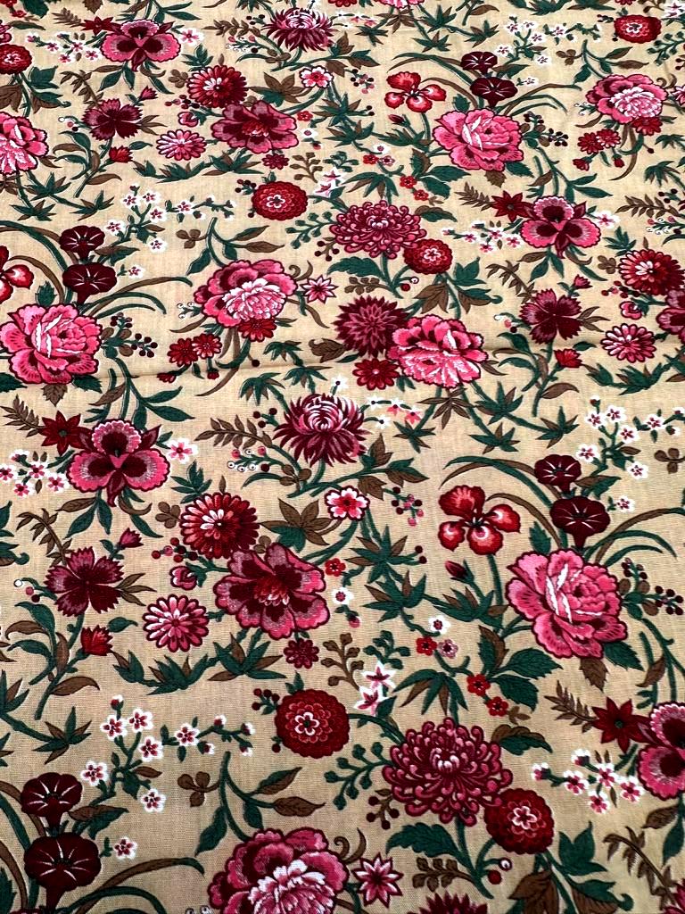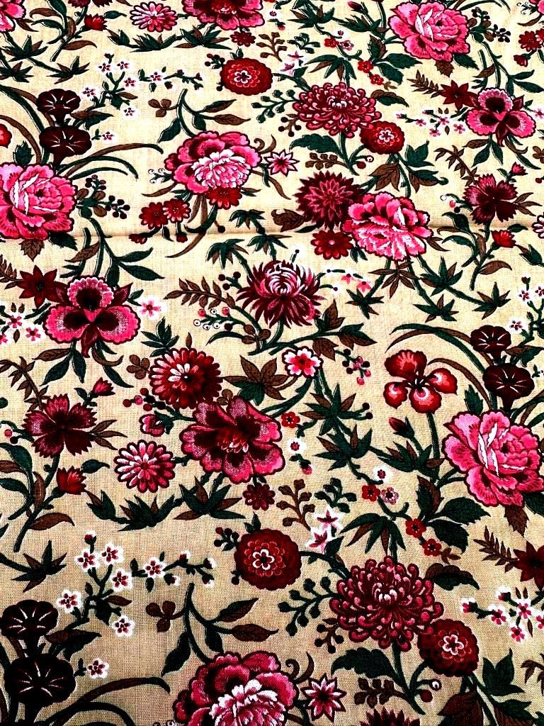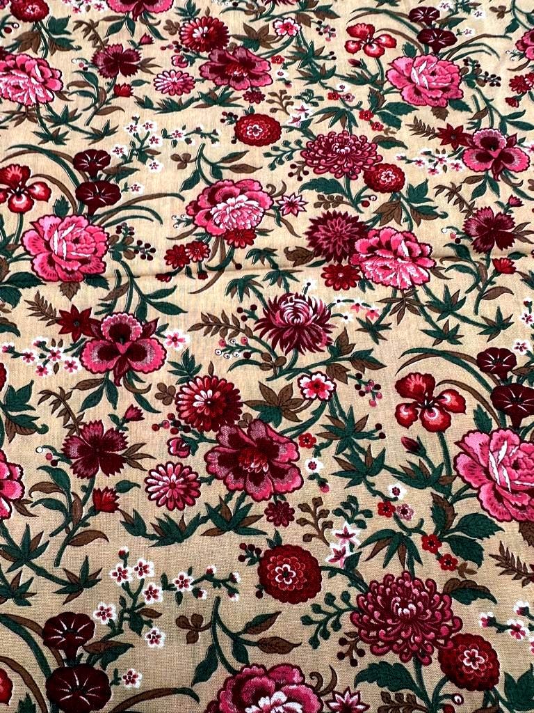Vintage Cranston Print Works Cotton Blend fabric, featuring Tan Background with Red and Pink Flowers and Green Leaves. The background has what is called "Tea Dyed" Look